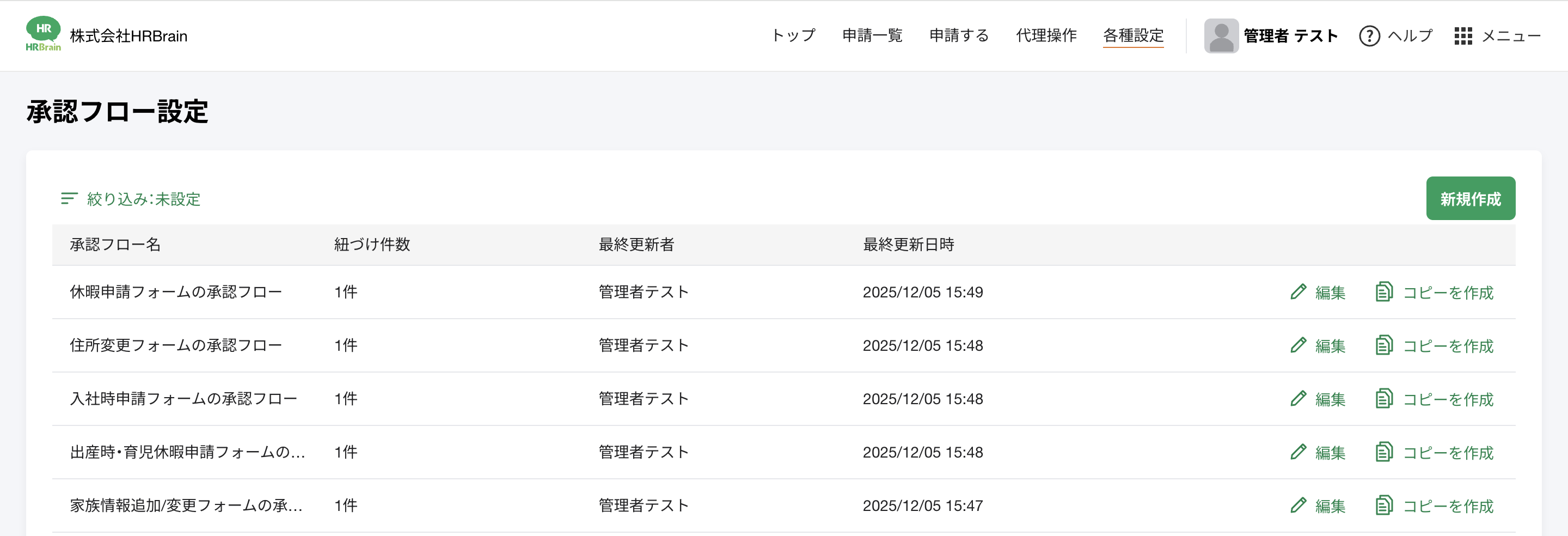 既存の「申請フォーム」が一つ作成されている場合、新機能の「承認フロー設定画面」には、そのフォームに対応した名前で承認フローが作成されます。