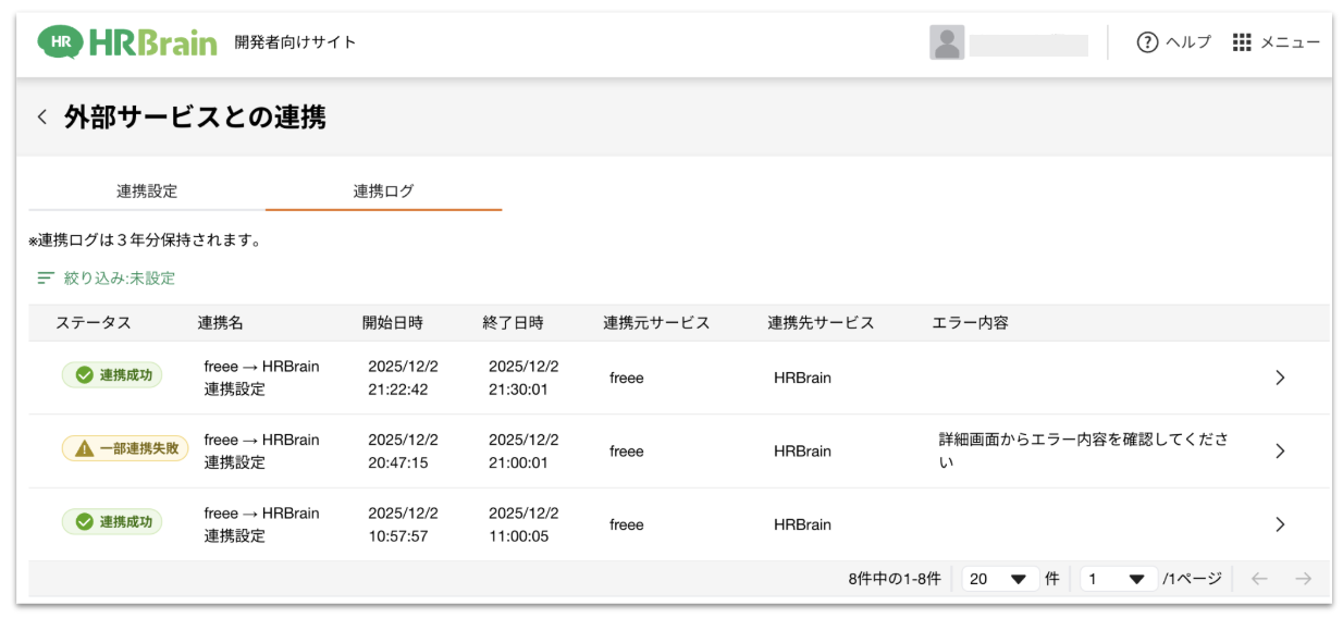 1.連携結果は[開発者向けサイト] > [外部サービスとの連携] > [連携ログ]から確認可能