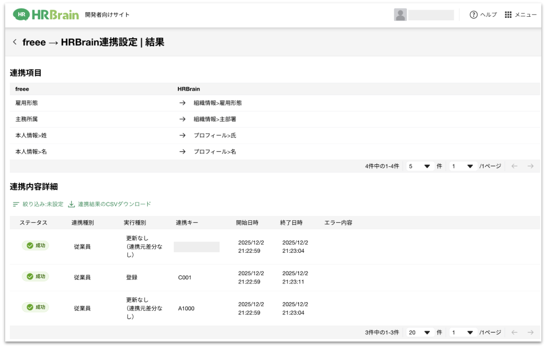 2.連携成功したログの「>」をクリックすることで、連携内容の詳細を確認可能