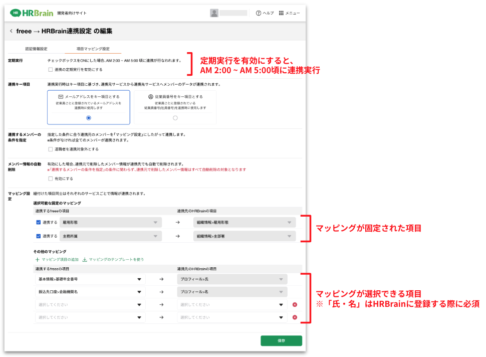 4.連携設定の[項目マッピング設定]で連携したい項目を選択し[保存]をクリック