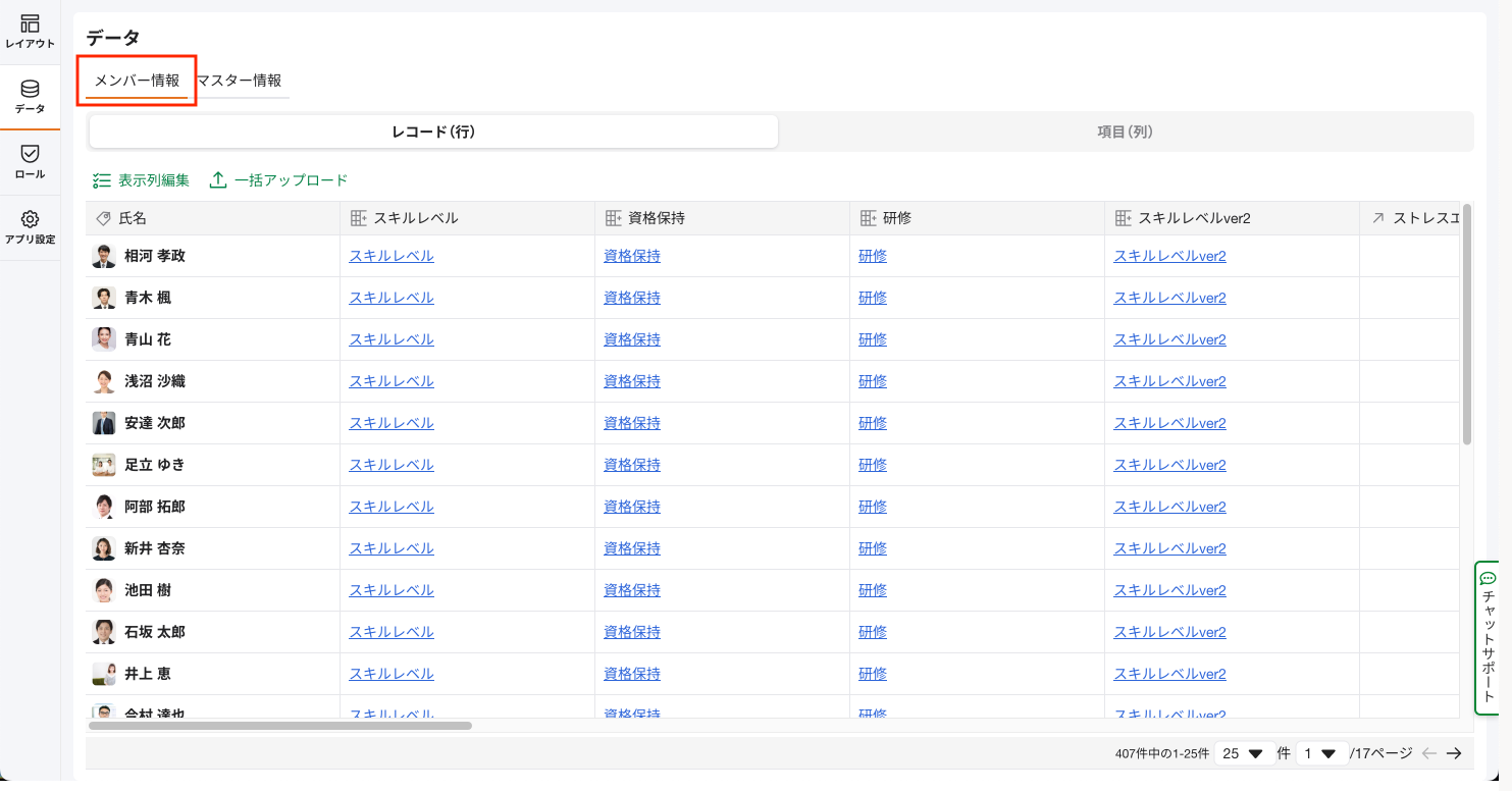 メンバー情報とは、氏名や保有スキル、自己紹介文など、メンバー(従業員)1人あたりが持つデータのことを指します。