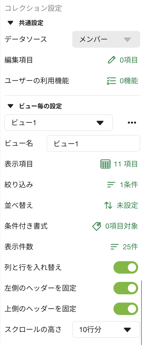 • データソース: 表示するデータの種類を選択します(メンバー、マスター情報など)。一度設定すると変更できないため、慎重に選択してください