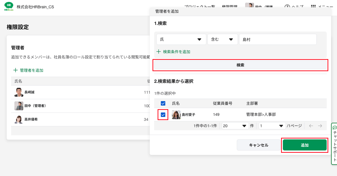 ②権限を付与したいメンバーを検索し、チェックを入れて、[追加]をクリック