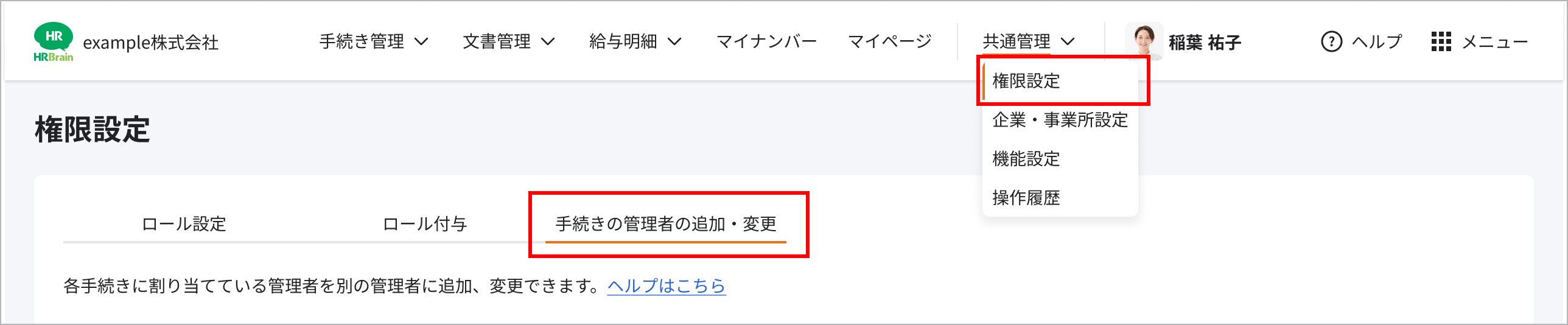 [共通管理]>[権限設定]にアクセスし、[手続きの管理者の追加・変更]タブを押す。