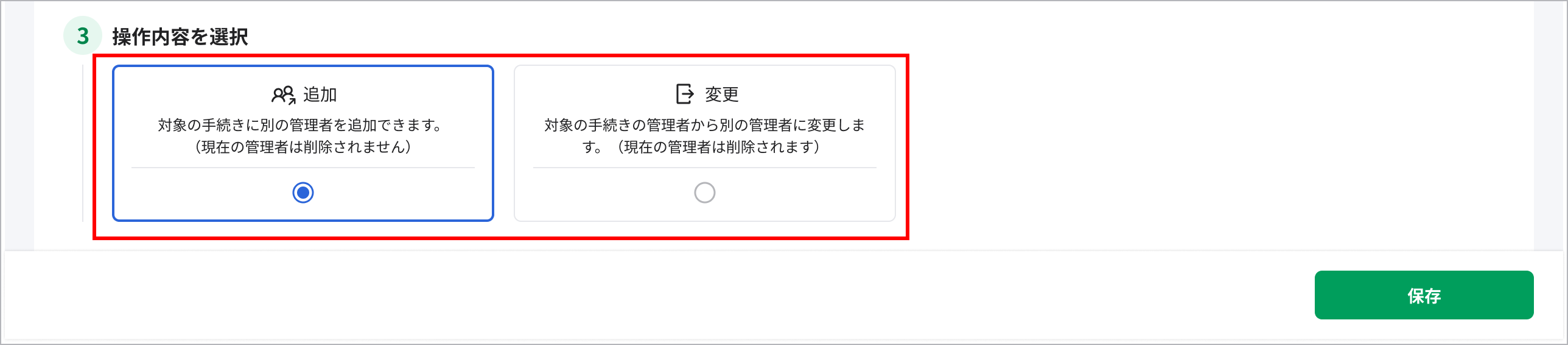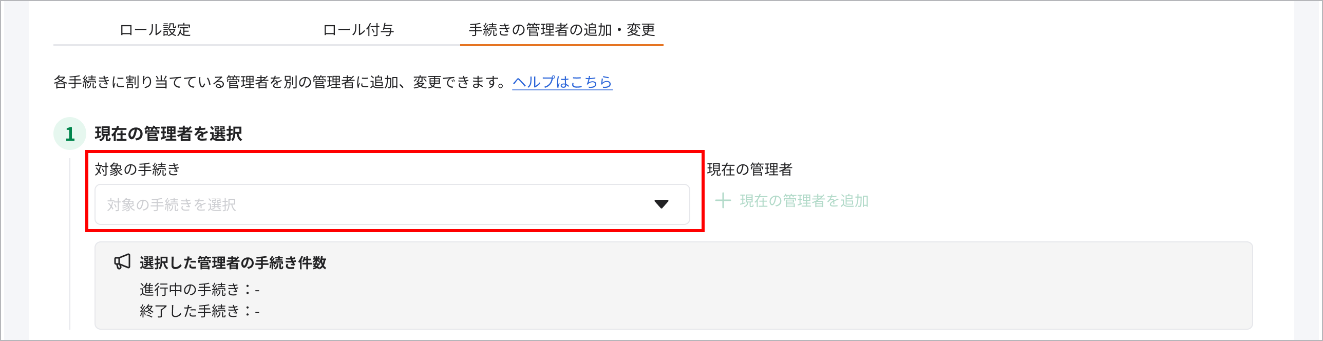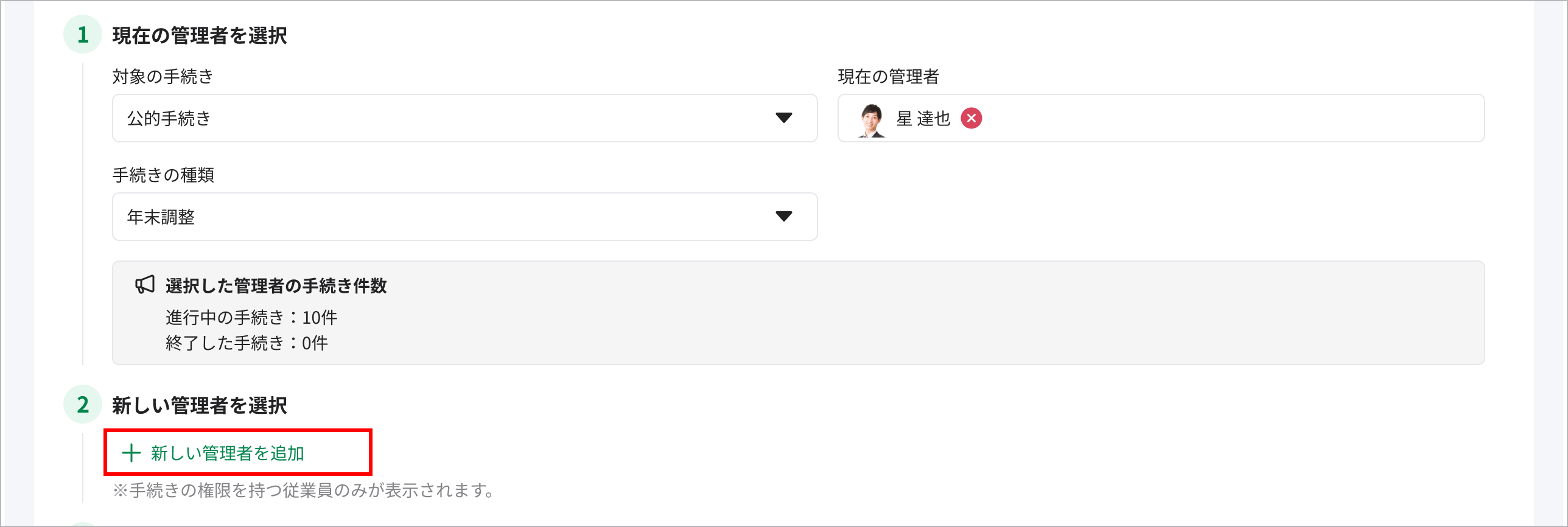 手続きごとに担当の管理者を追加したり、既存の管理者を別の管理者に変更できる機能です。