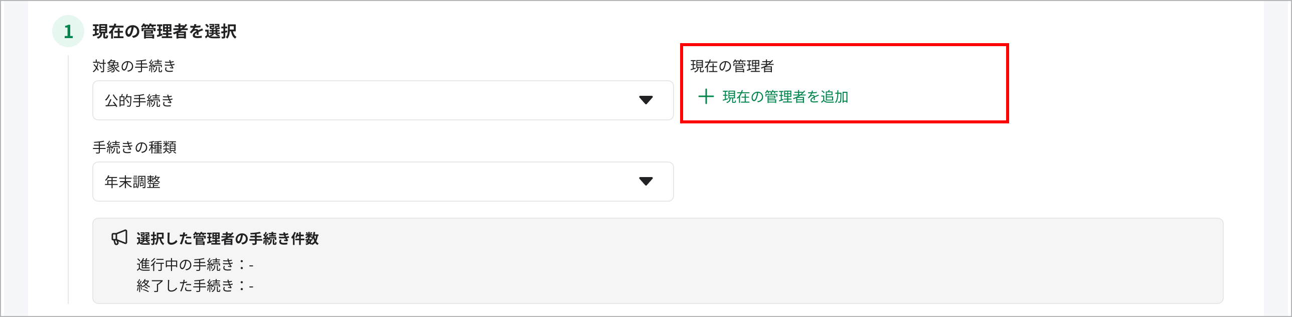 [+現在の管理者を追加]から管理者を選択すると、その管理者が担当している進行中・終了した手続き件数が表示されます。