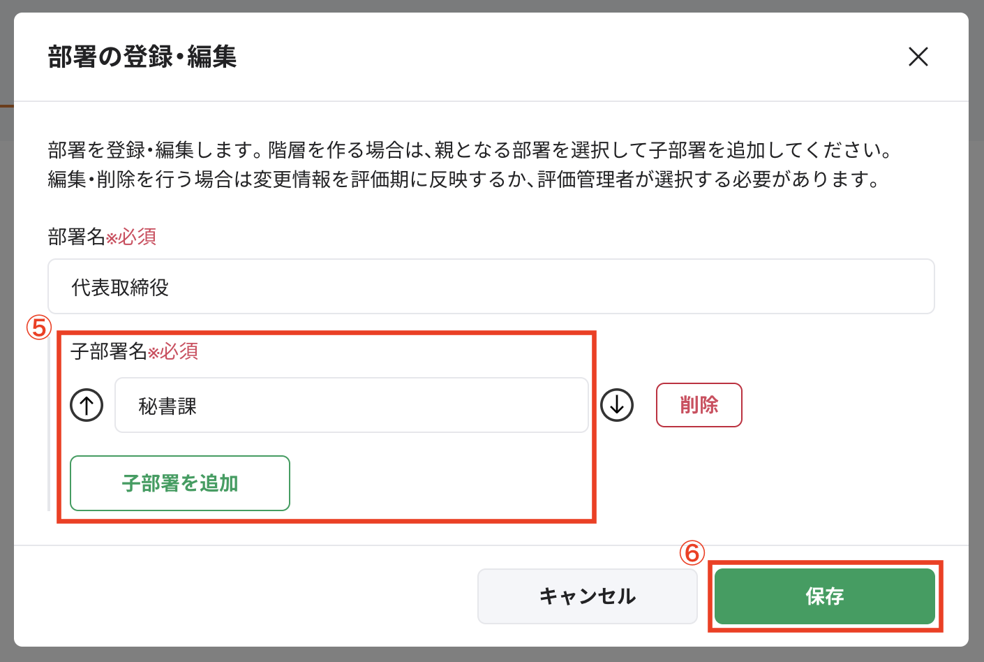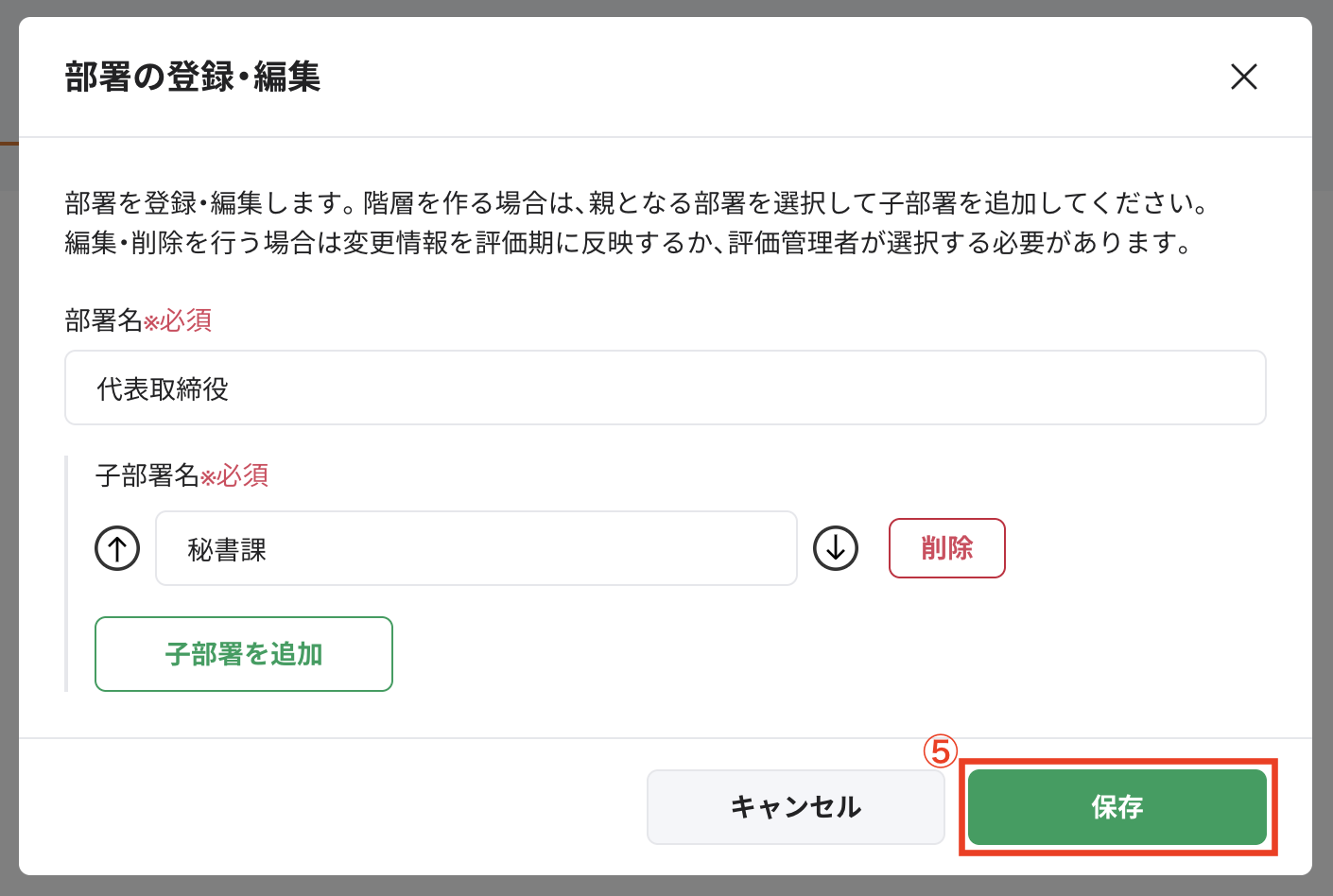 ⑤[子部署を追加]をクリックし、③で選択した部署を親部署とした場合の子部署名を入力