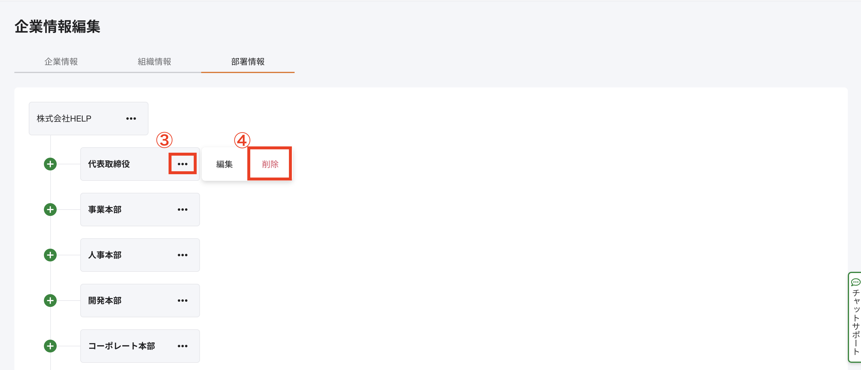 ③親となる部署名のメニュー[・・・]にカーソルを合わせる(部署が一つもないときは[会社名]のメニューにカーソルを合わせる)