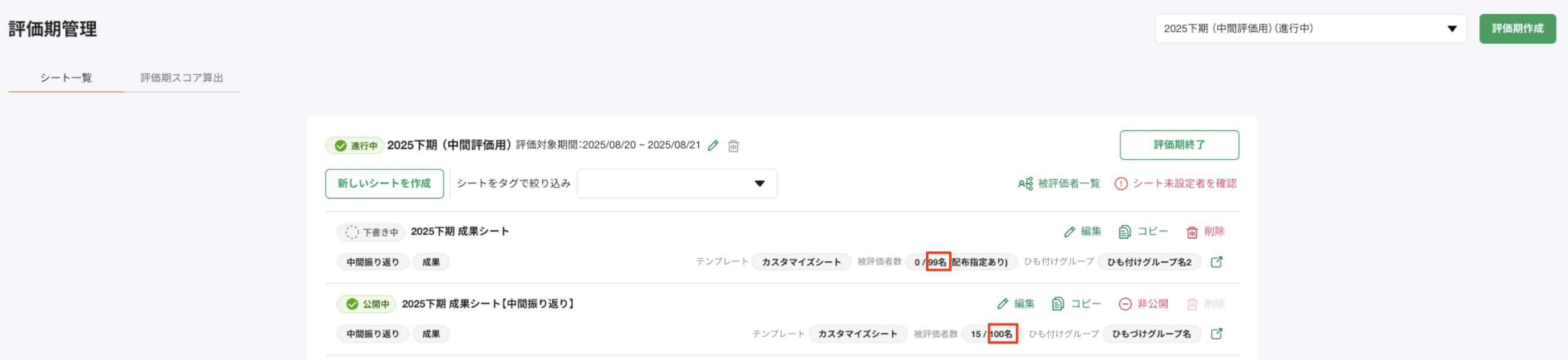 評価者やシートの設定に不備があっても[シート未設定のメンバー] > [評価未設定者]のタブに表示されなくなります。