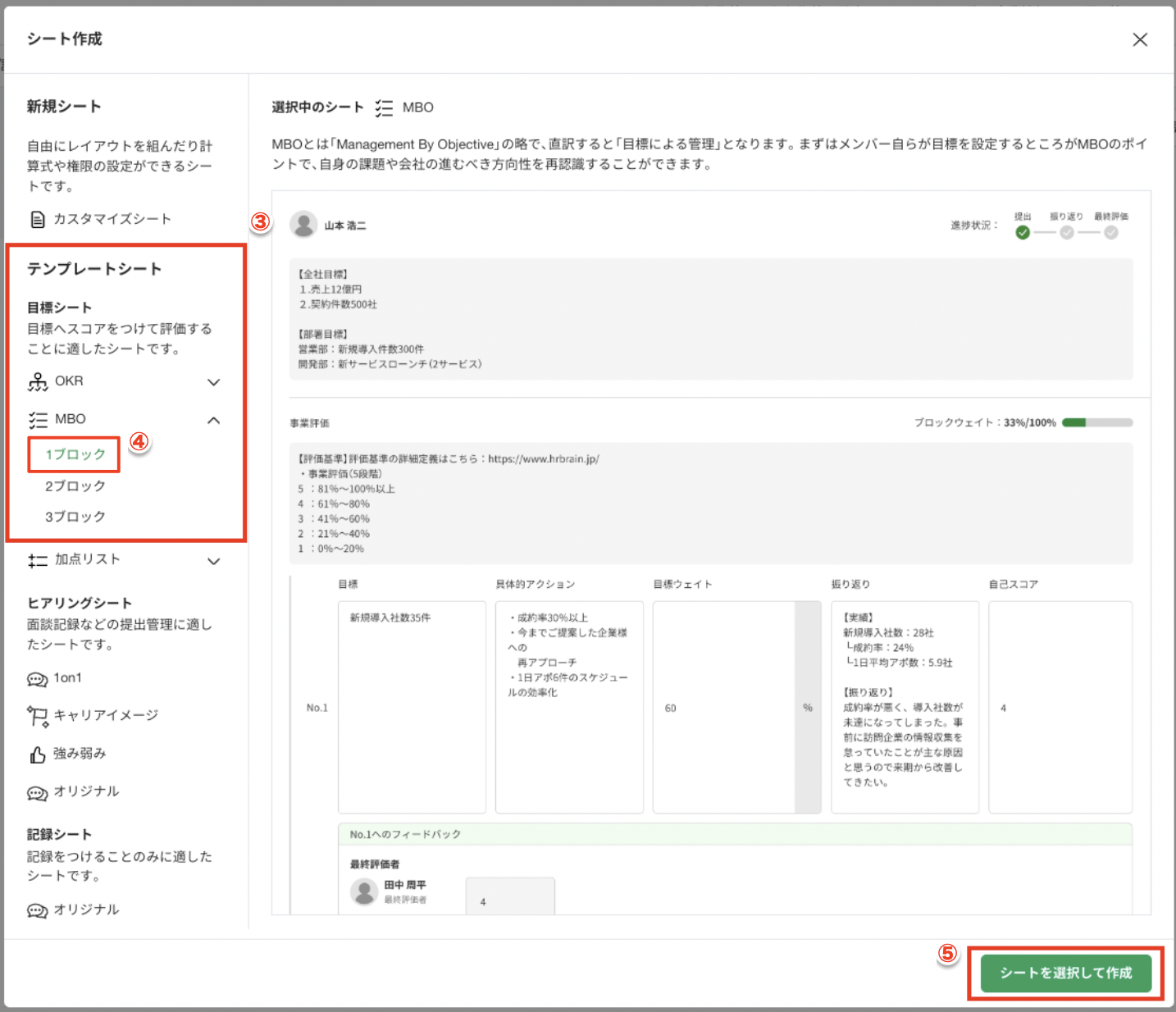 ④目標シートはブロック数を選択、ヒアリングシートはテンプレート名を選択すると画面右下[テンプレートを選択]ボタンが表示され、シート作成が行えるようになります。