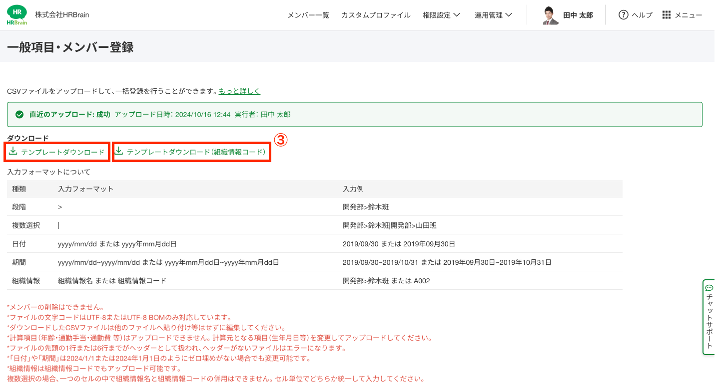 ③[テンプレートダウンロード]または[テンプレートダウンロード(組織情報コード)]ボタンよりテンプレートをダウンロードして、CSVファイルに情報を追加します。
