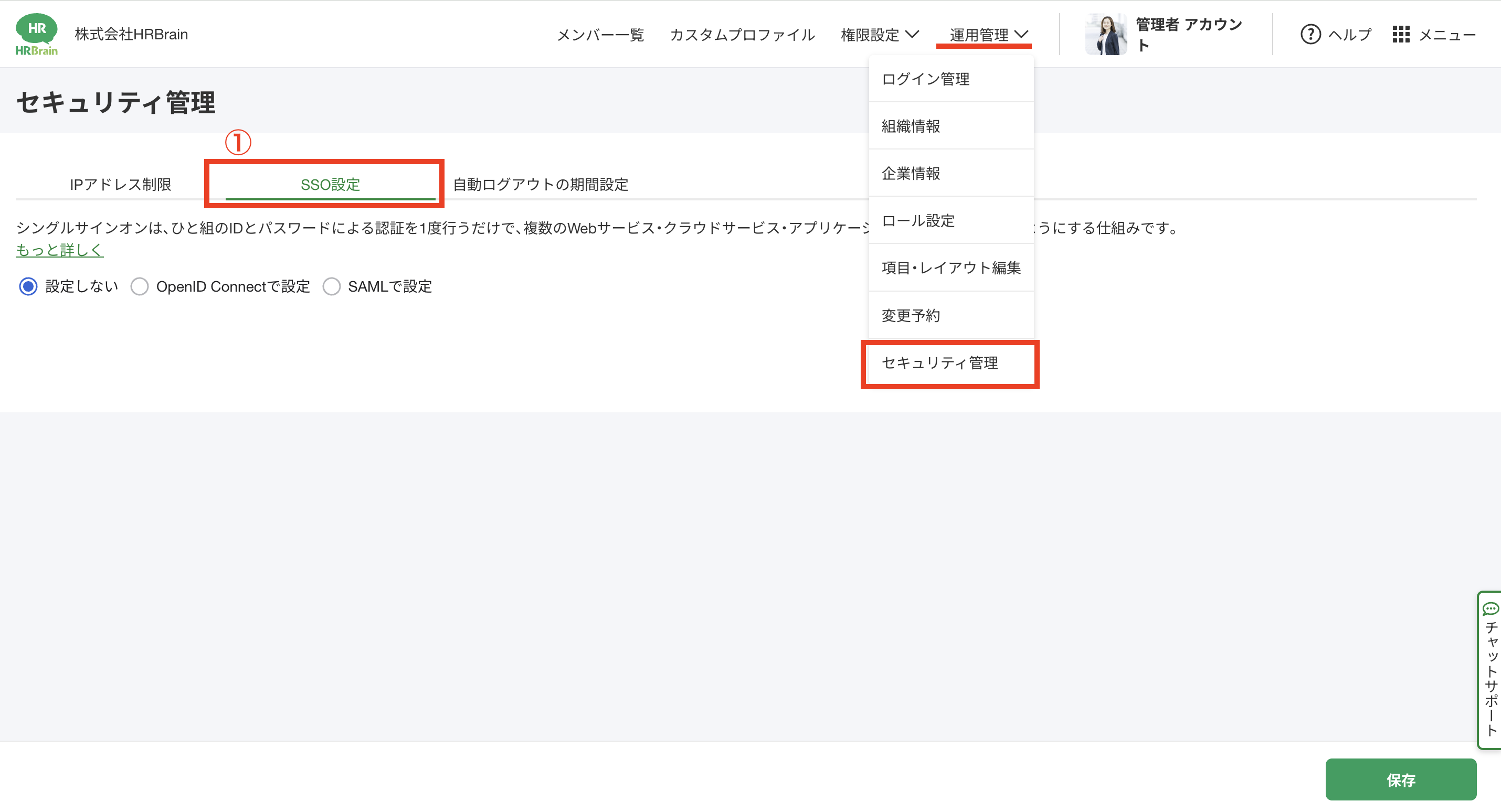 ①社員名簿>運用管理>セキュリティ管理>SSO設定をクリック