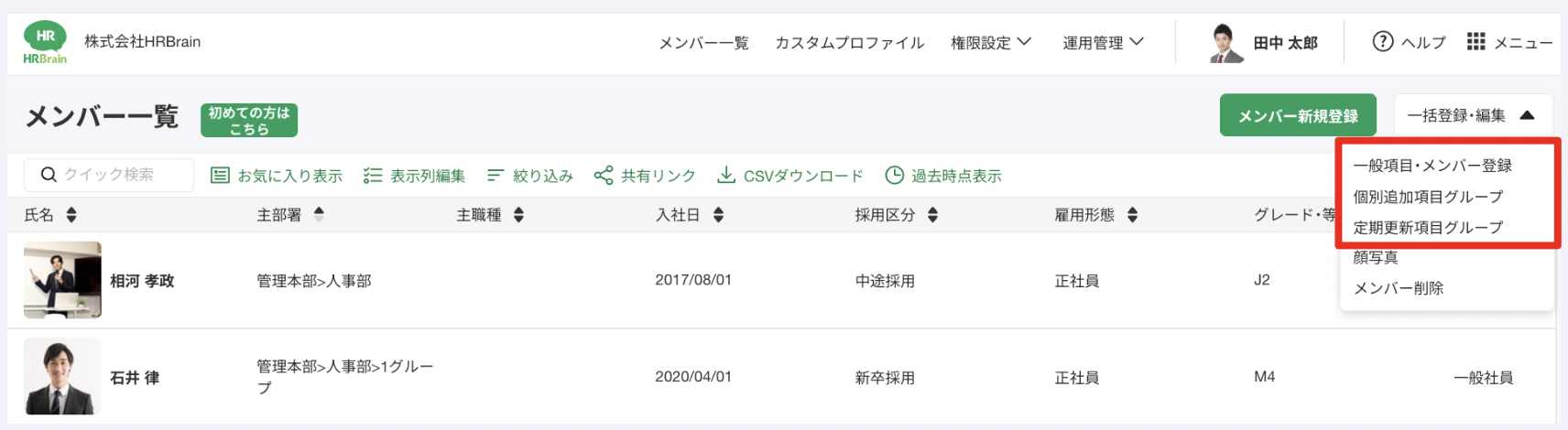 社員名簿 > メンバー一覧 > 一括登録・編集 > [一般項目・メンバー登録]の画面から、[テンプレートダウンロード]してください。