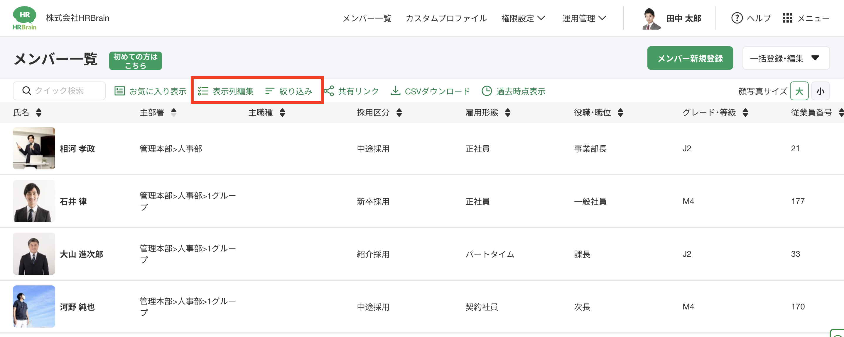 社員名簿では、メンバー一覧の画面から[表示列編集]、[メンバーの並べ替え]、[メンバーの絞り込み]を行うことができます。