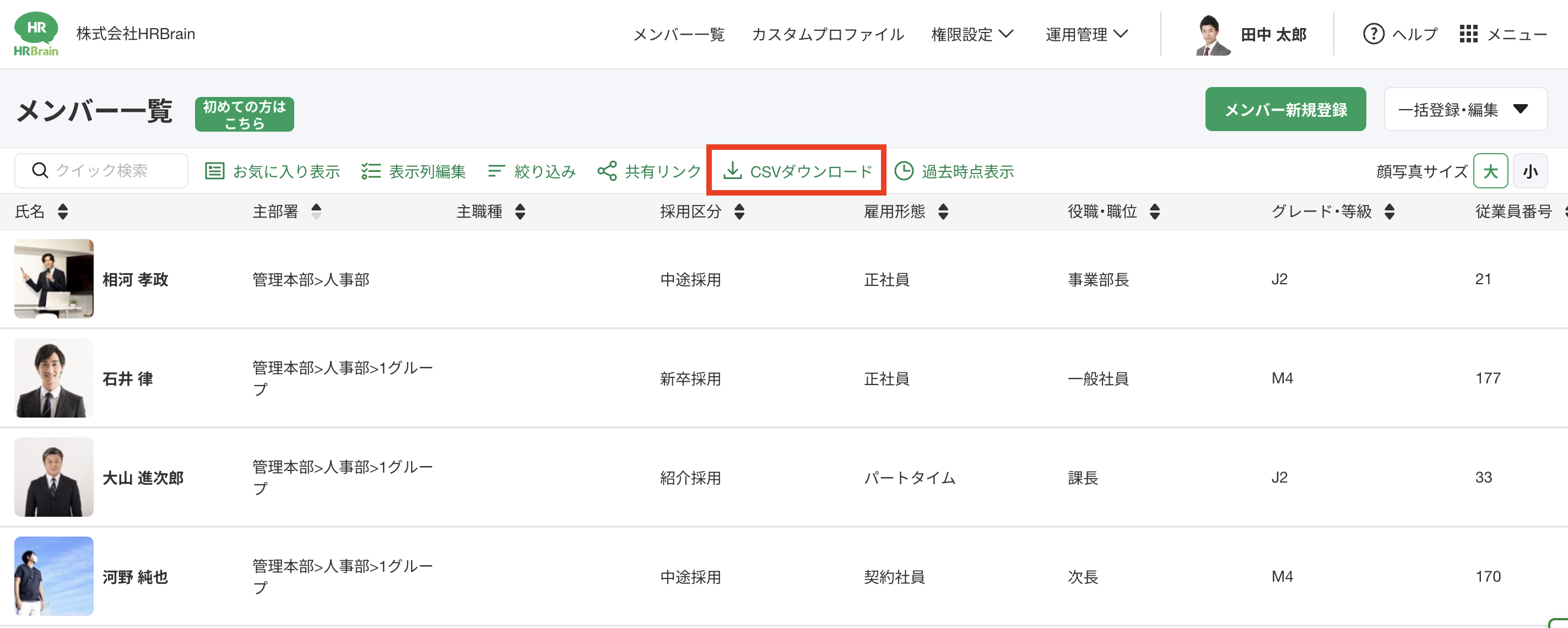 →以上の工程で作成したメンバー一覧画面を、CSVとしてそのままダウンロードすることが可能です。