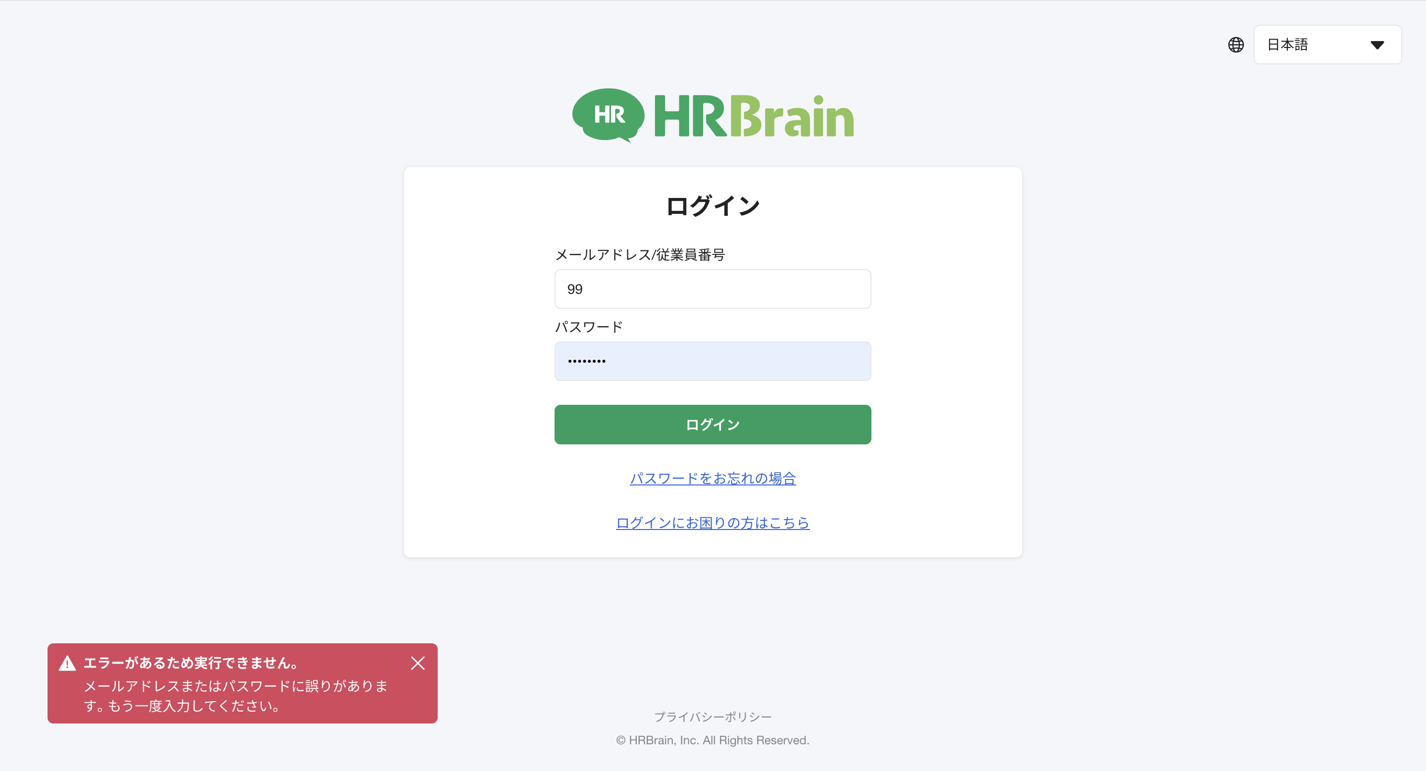 メールアドレスまたはパスワードに誤りがあります。もう一度入力してください。
