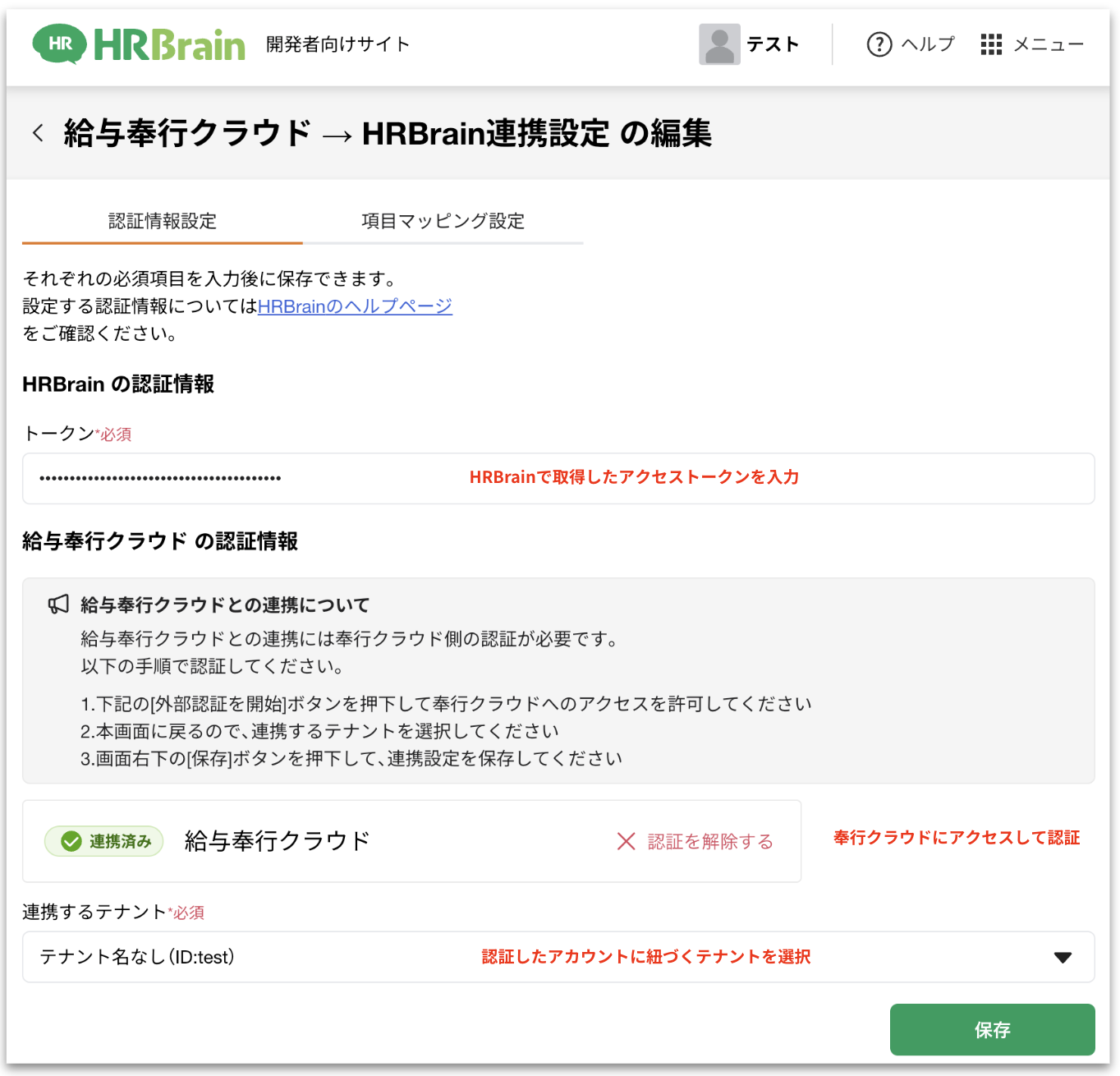 3.[連携設定] > [認証情報設定]でHRBrainと給与奉行クラウドを認証