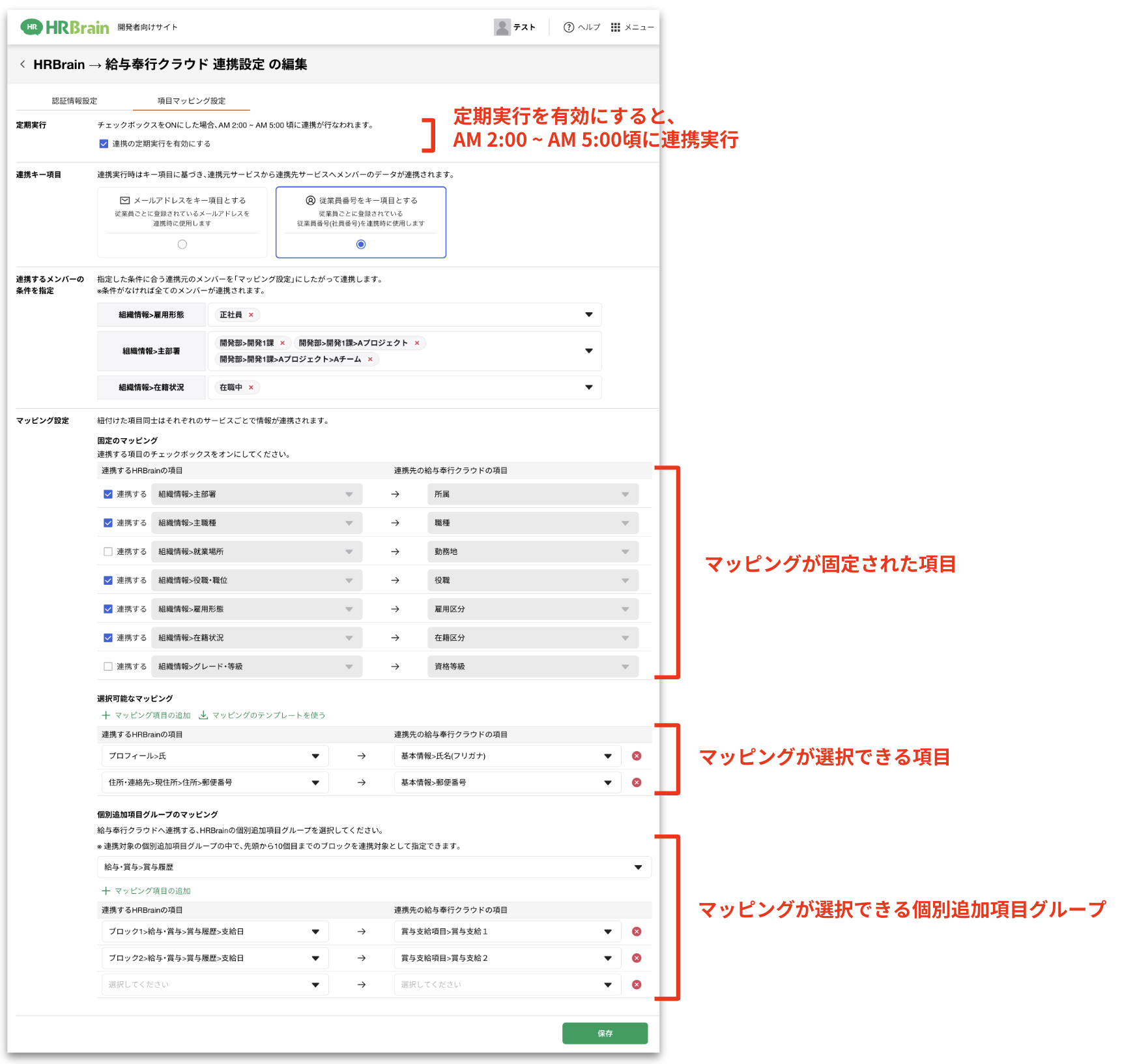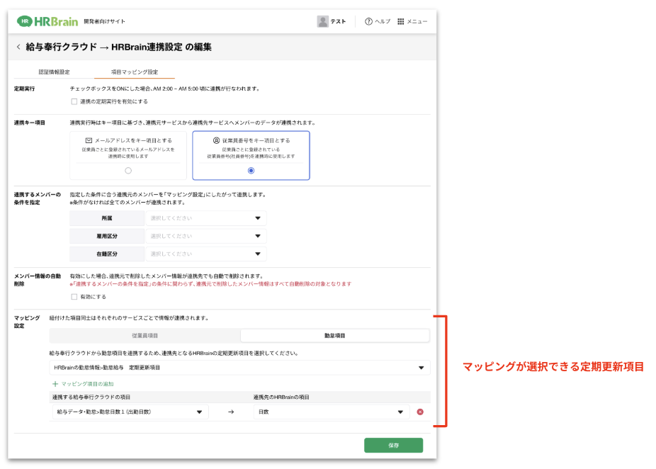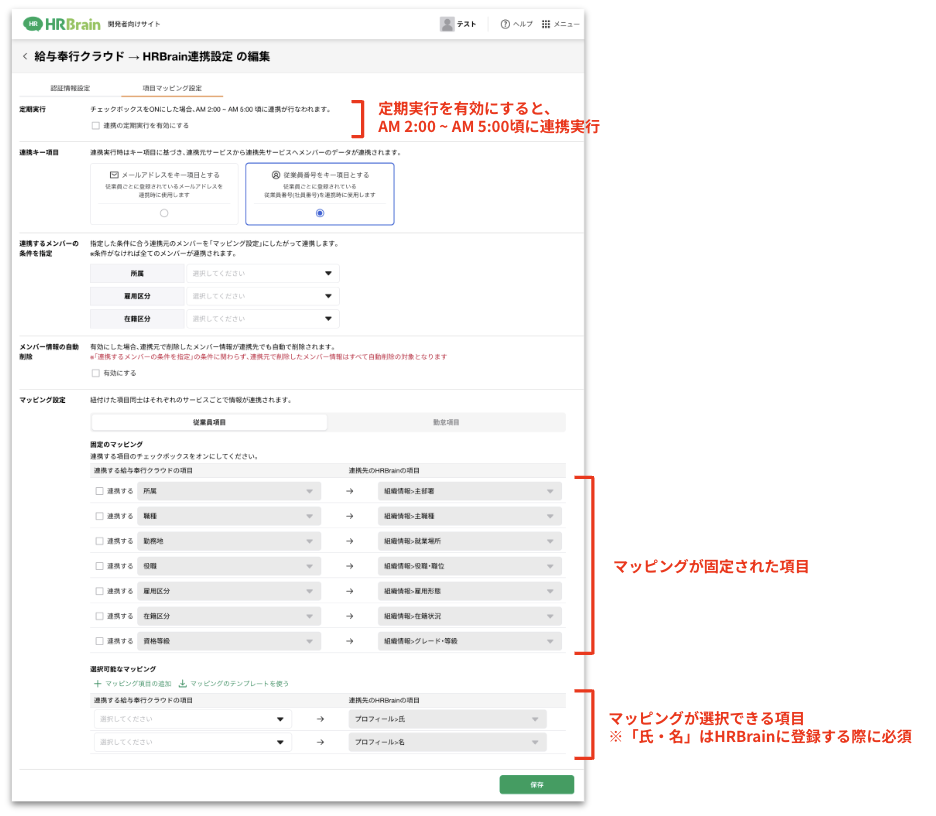 - HRBrainと給与奉行クラウドのどちらからの連携でも連携項目が固定になります
