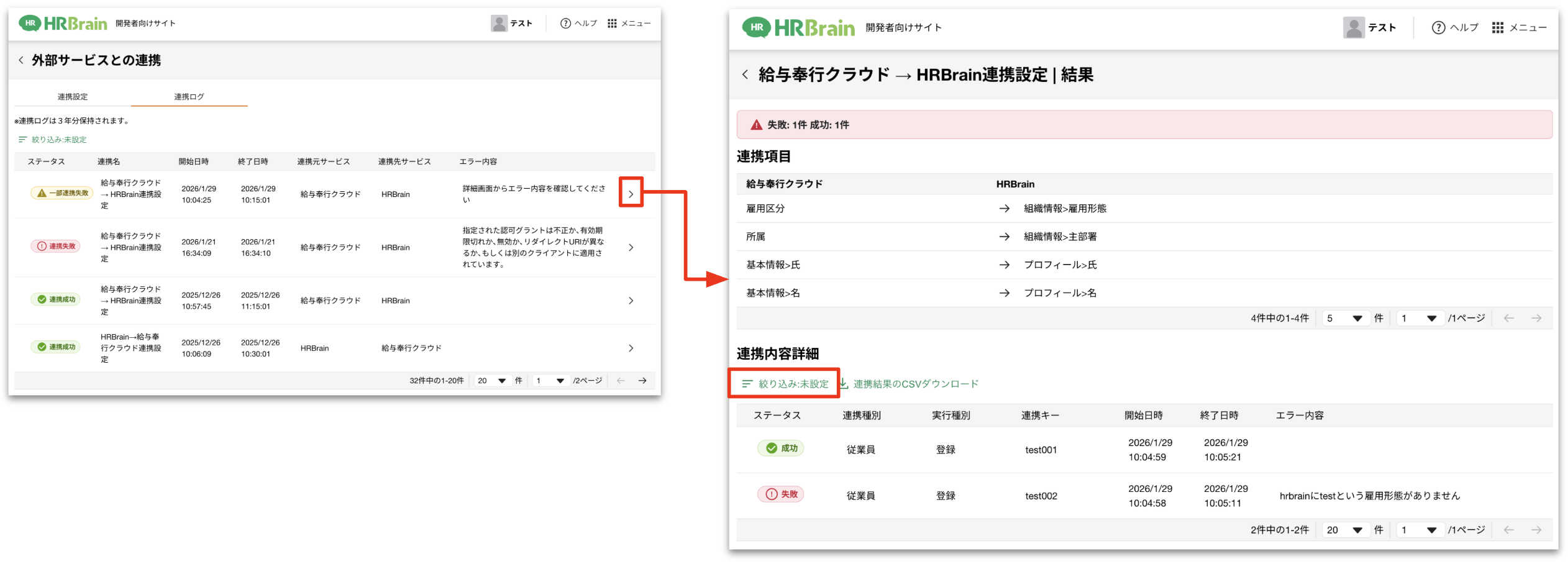 2.[連携ログ]の「>」をクリックすることで、連携内容の詳細を確認可能(ステータスによる絞り込みも可能)