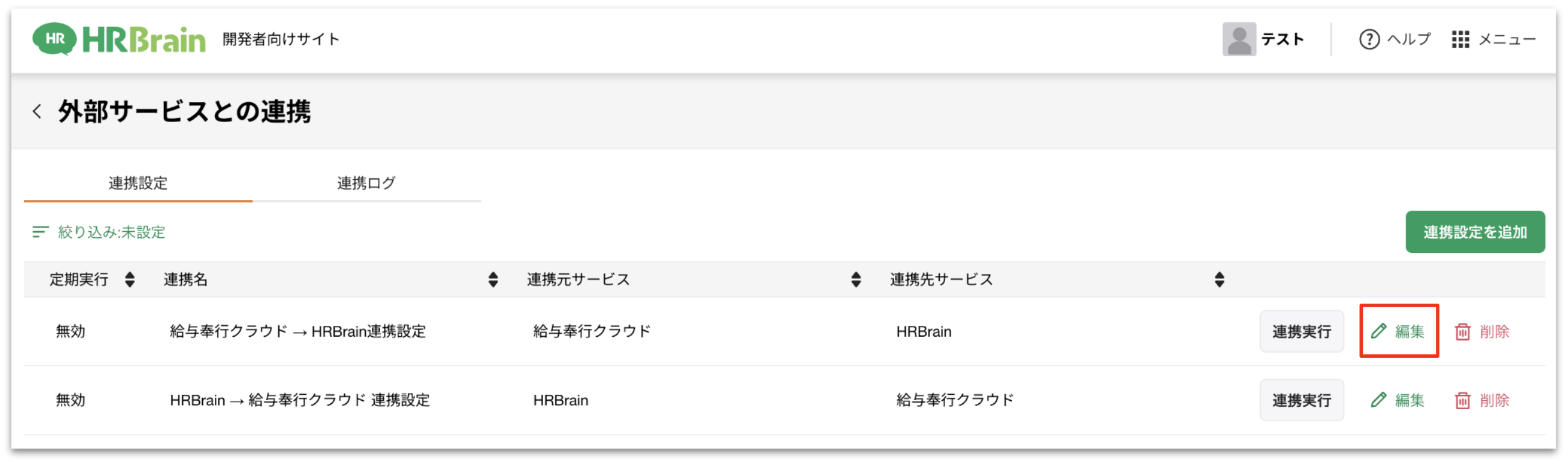 保存された設定は[開発者向けサイト] > [外部サービスとの連携] > [連携設定]に一覧表示