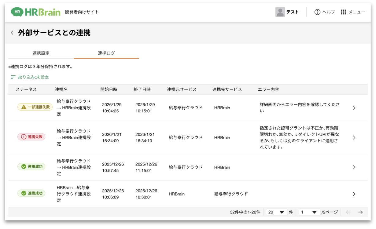 1.連携結果は[開発者向けサイト] > [外部サービスとの連携] > [連携ログ]から確認可能
