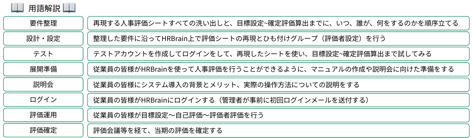 人事評価の運用(目標設定〜評価結果確定)がHRBrain上で完結している状態がゴールとなります。
