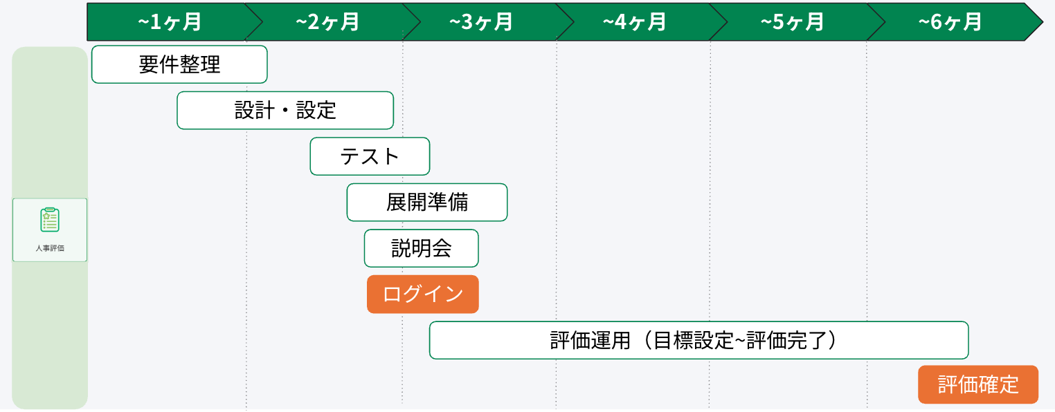 人事評価と合わせて、HRBrainご導入から従業員への展開まで、およそ2〜3ヶ月の期間で設定されるお客様が多いです。