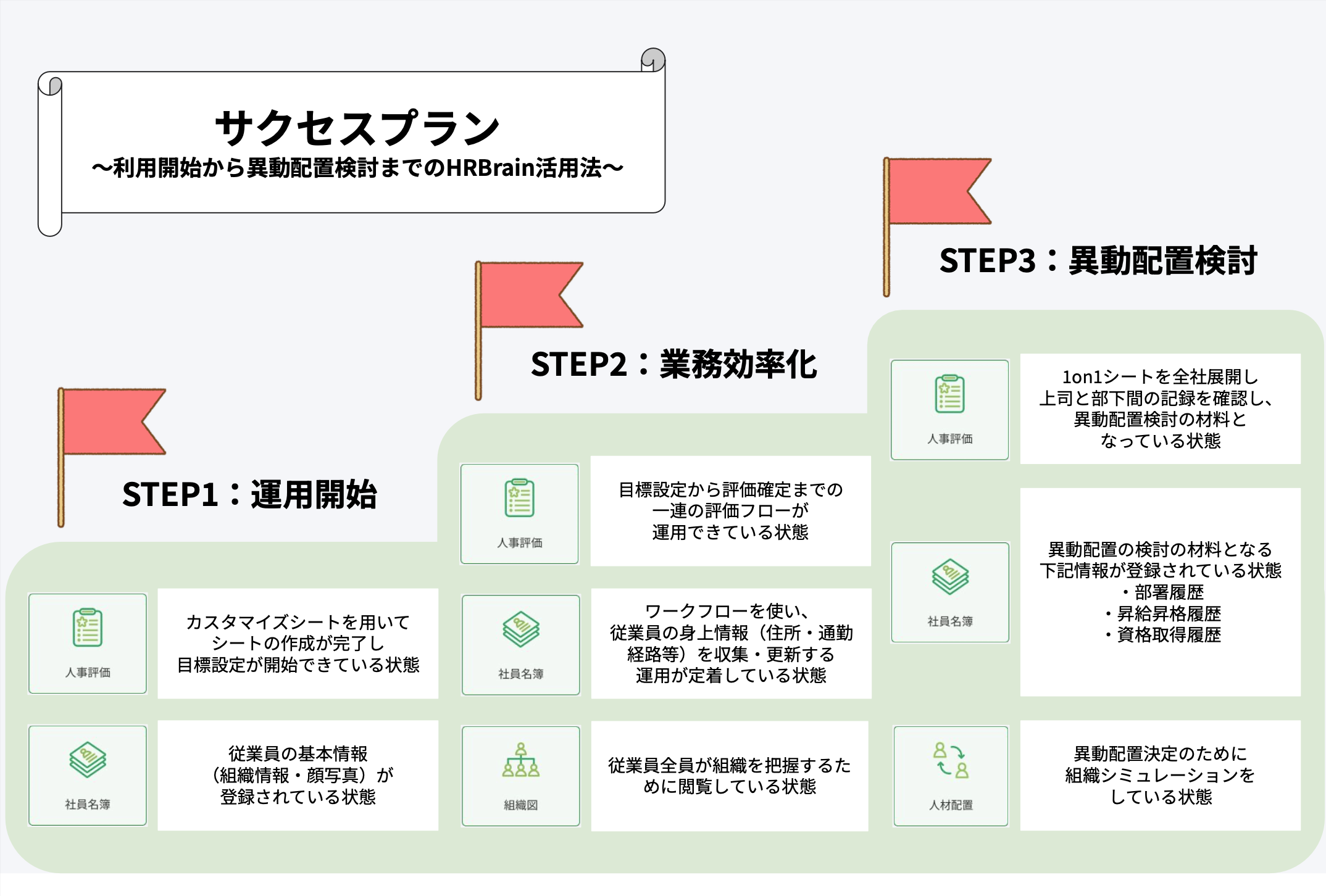 サクセスプランは「STEP1:運用開始」「STEP2:業務効率化」「STEP3:異動配置の検討」の3段階で構成されます。