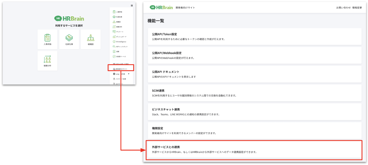 1.[メニュー] > [開発者向けサイト] > [外部サービスとの連携]をクリック
