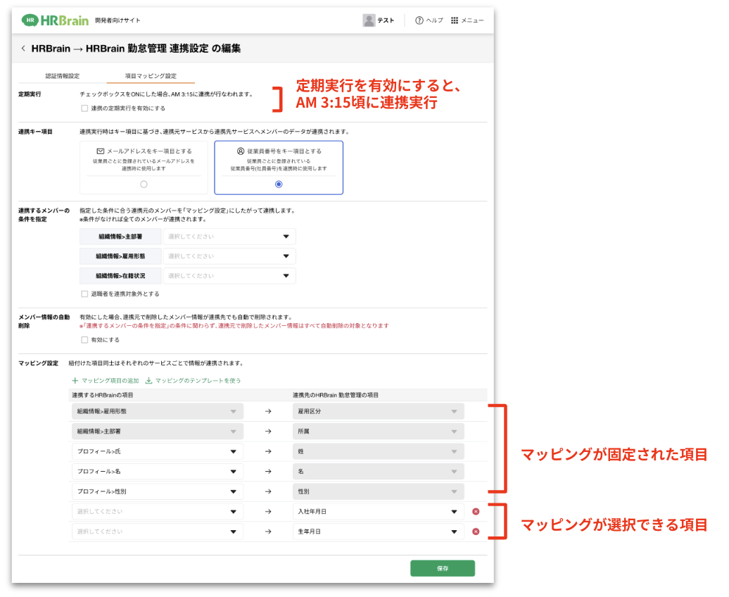 - HRBrain勤怠管理→HRBrainへの連携時のみマッピング設定が可能です