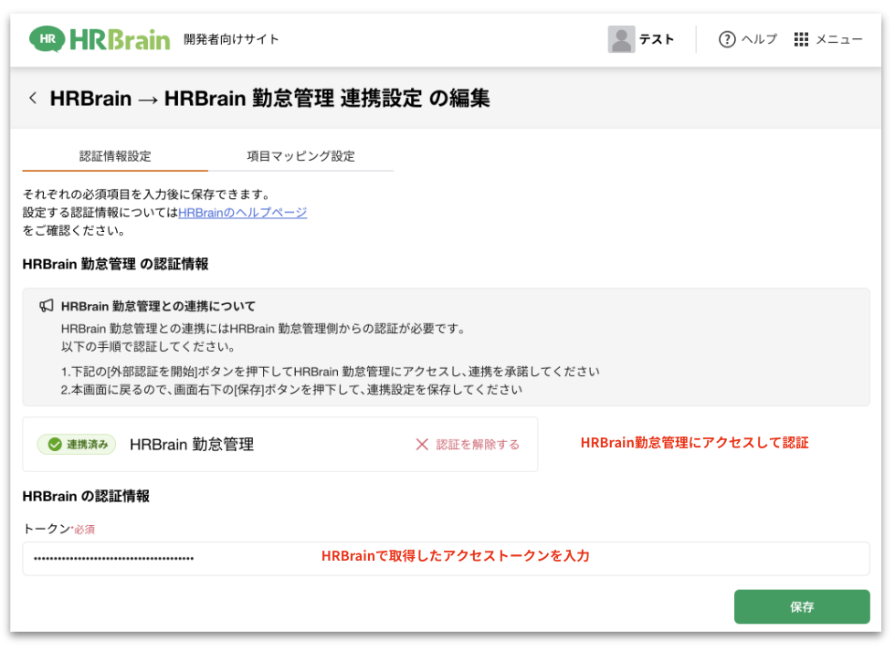 3.[連携設定] > [認証情報設定]でHRBrain勤怠管理とHRBrainを認証