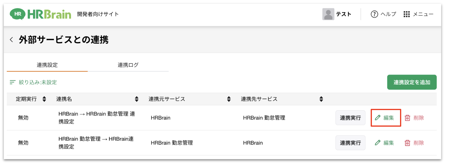 保存された設定は[開発者向けサイト] > [外部サービスとの連携] > [連携設定]に一覧表示