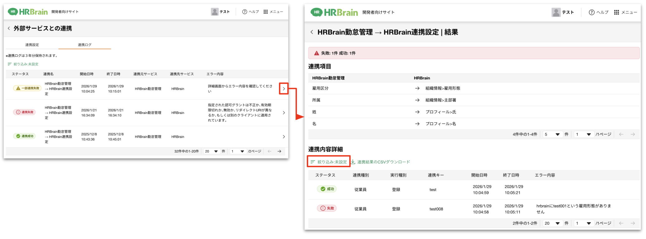 2.[連携ログ]の「>」をクリックすることで、連携内容の詳細を確認可能(ステータスによる絞り込みも可能)