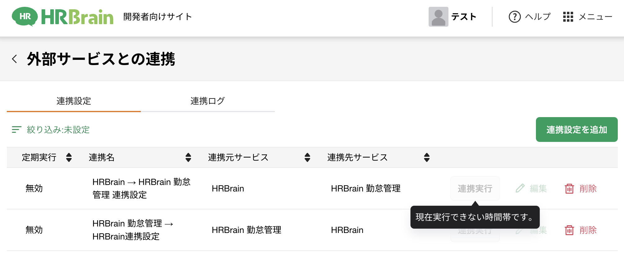AM8:30〜AM10:00とPM5:30〜PM6:30の時間帯はHRBrain勤怠管理の連携操作が行えません(手動連携・設定編集が不可)。