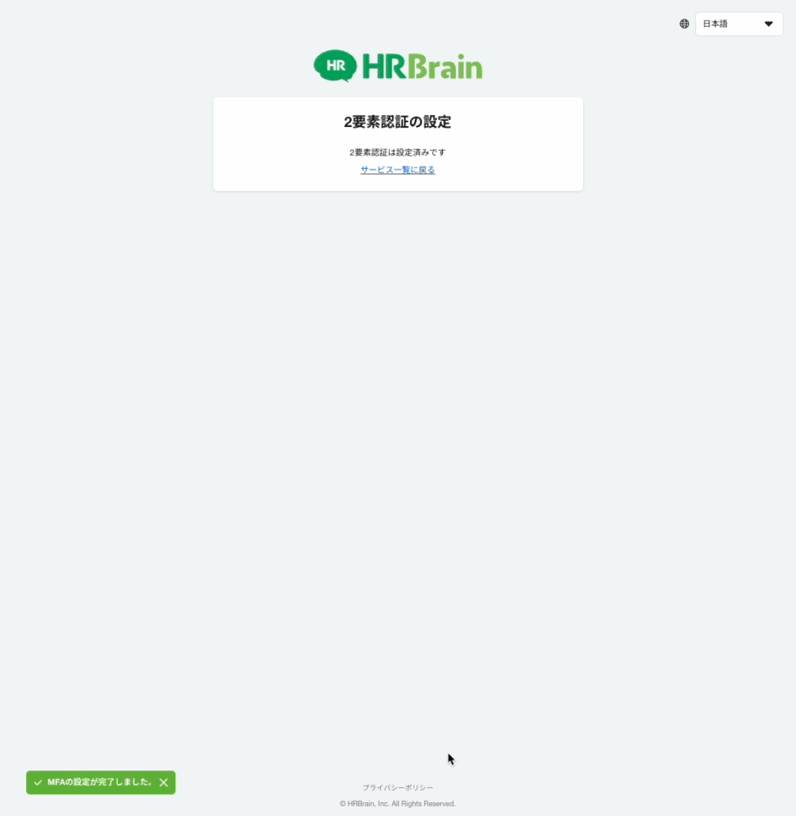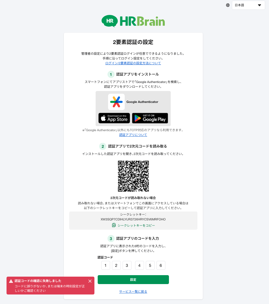 QRコード(シークレットキー)が発行された10分以内にコード入力まで行い、[2要素認証は設定済みです]と表示されたことを確認してください。