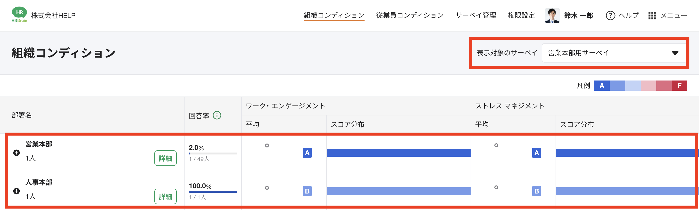 組織コンディションには全ての部署が表示されるため、「営業本部用サーベイ」として配布していても、回答者が違う部署(人事本部)に所属していれば「営業本部用サーベイ」には人事本部のスコアとして表示されます。