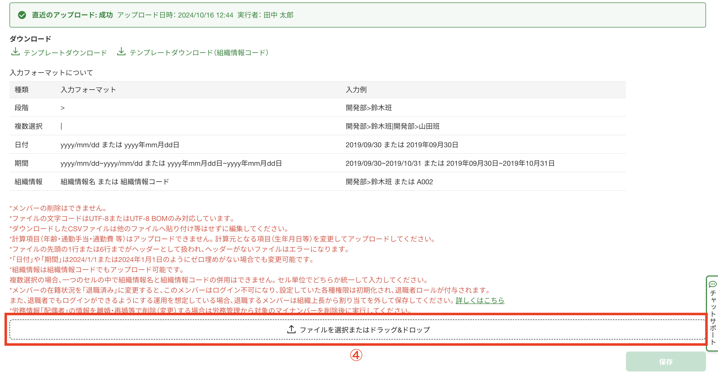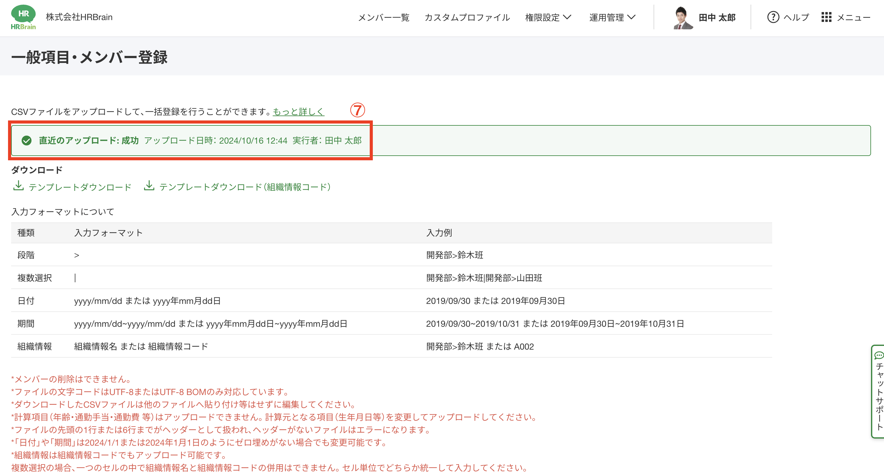 ⑦画面右上に「直近のアップロード: 成功 アップロード日時: 202◯年00月00日00時00分 実行者: 〇〇 〇〇」と表示されたら完了です。