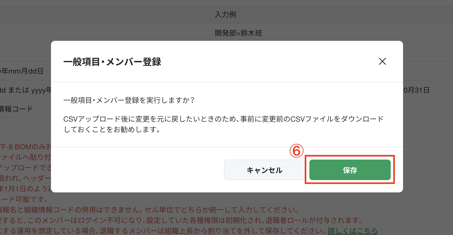 ⑥「一般項目・メンバー登録を実行しますか?」とポップアップが表示されるので、右下の[保存]をクリック