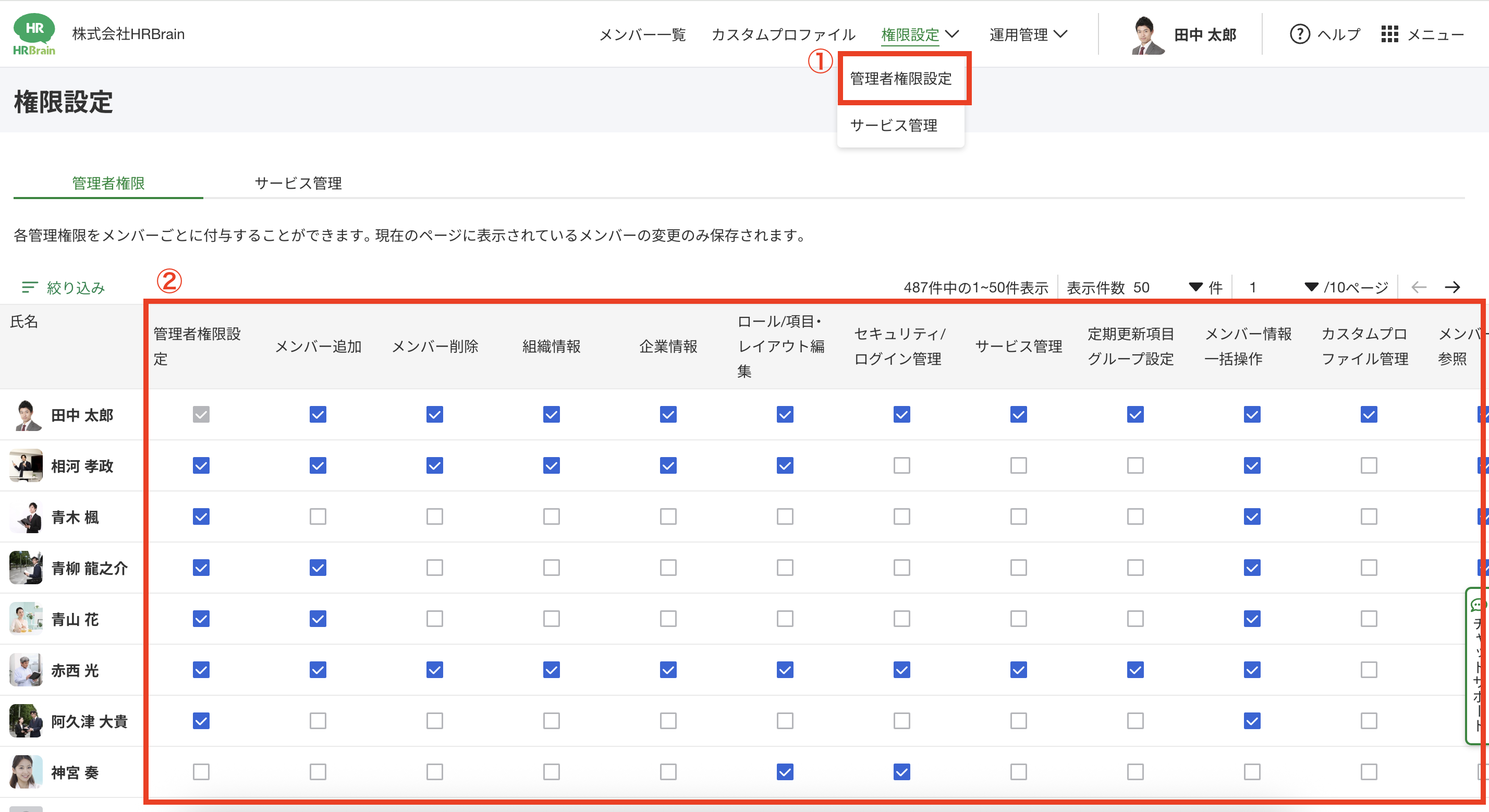 ※管理者権限設定を付与されると、管理者権限画面で「誰」に「どの権限を与えるか」を設定できます。