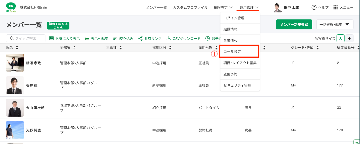 ①[社員名簿>運用管理>ロール設定]をクリックします。