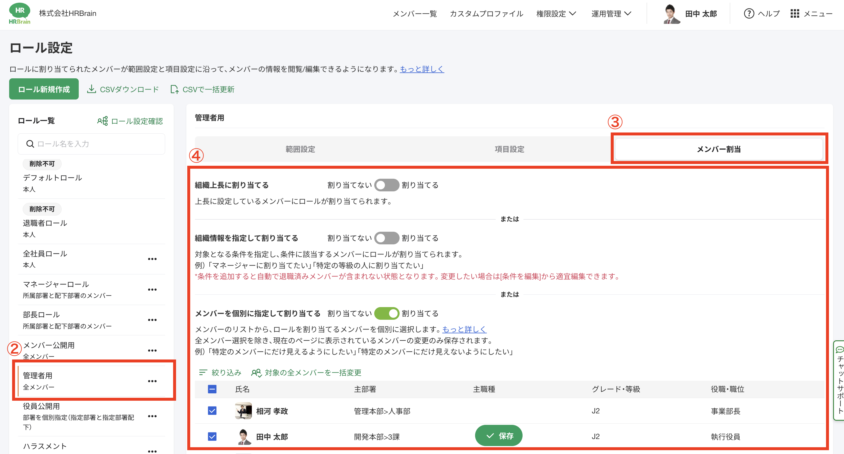 社員名簿に登録されたデータを誰が、誰の、何の項目を閲覧/編集できるかを設定する機能を[ロール設定]と呼びます。