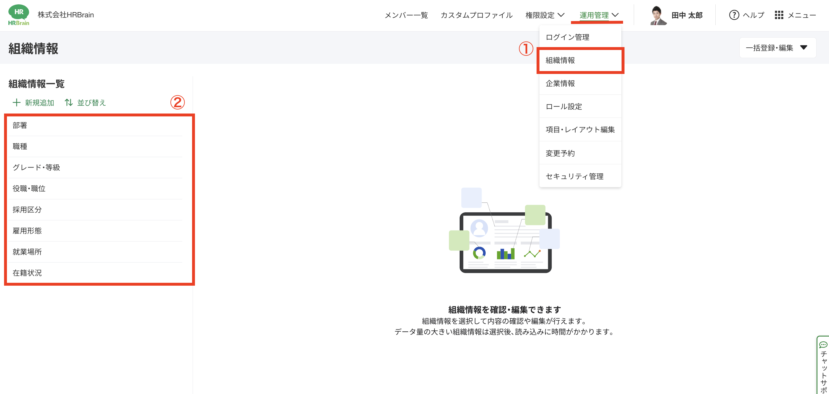 ①[運用管理] > [組織情報]をクリックすると組織情報設定画面が表示されます。