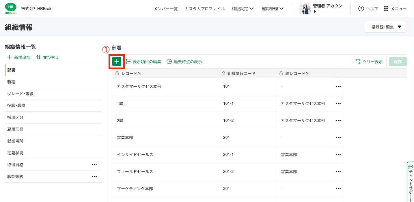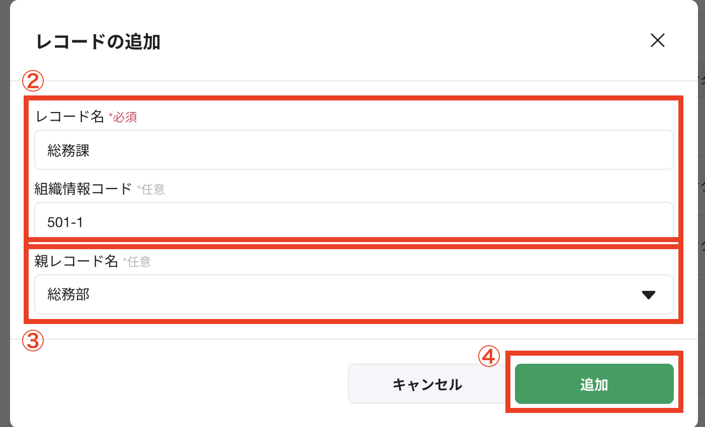 ④[追加]ボタンをクリックすると、③で選択した親レコードの子部署として追加されます。
