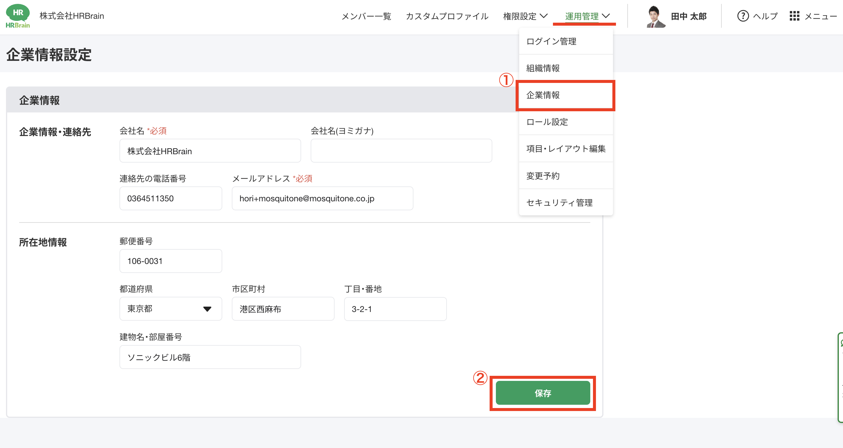 ①ナビゲーション>運用管理>[企業情報]をクリック