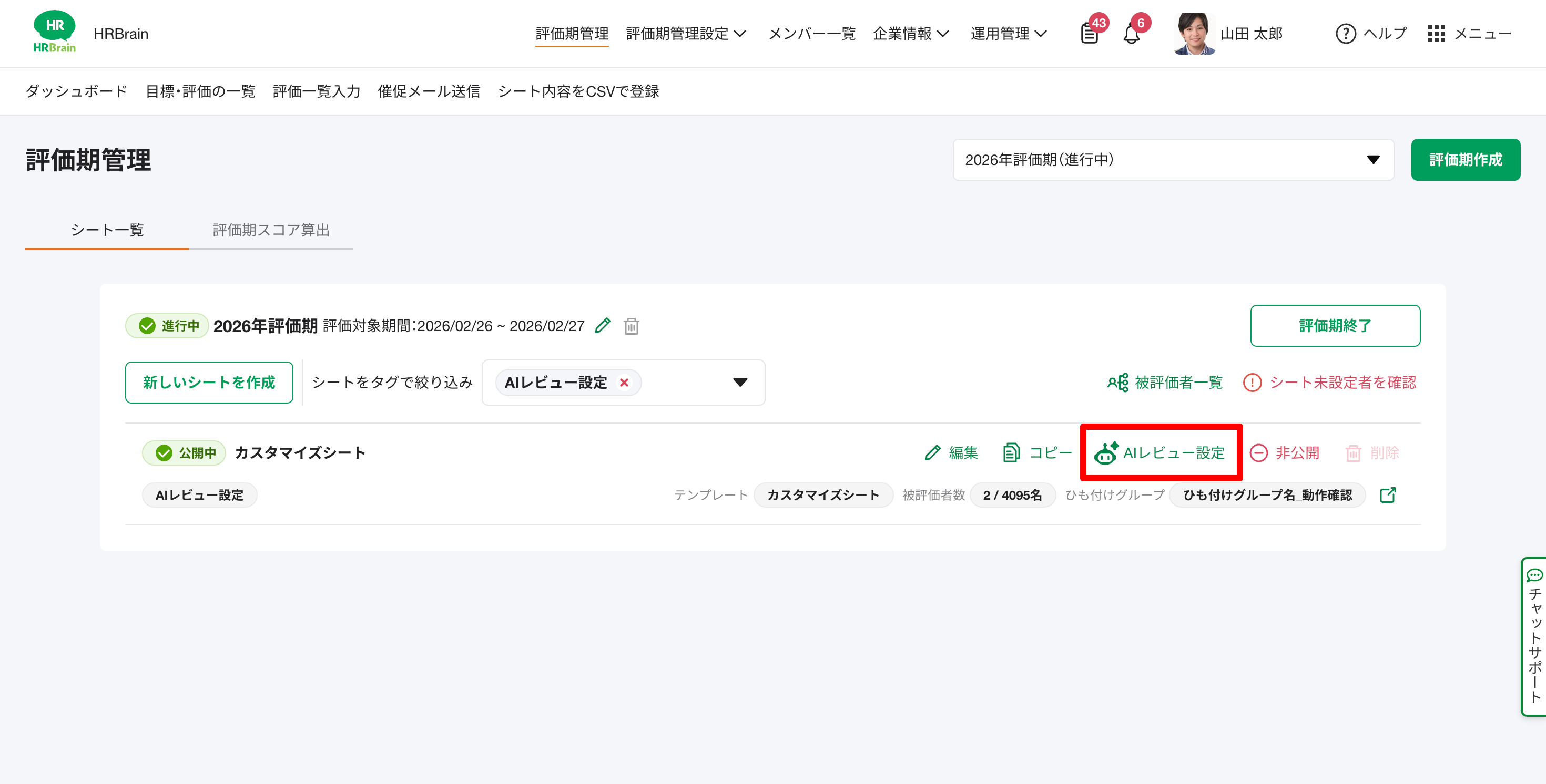 ①評価期管理画面のシート一覧を開き、AIレビューを設定したいシートの「AIレビュー設定」ボタンをクリック