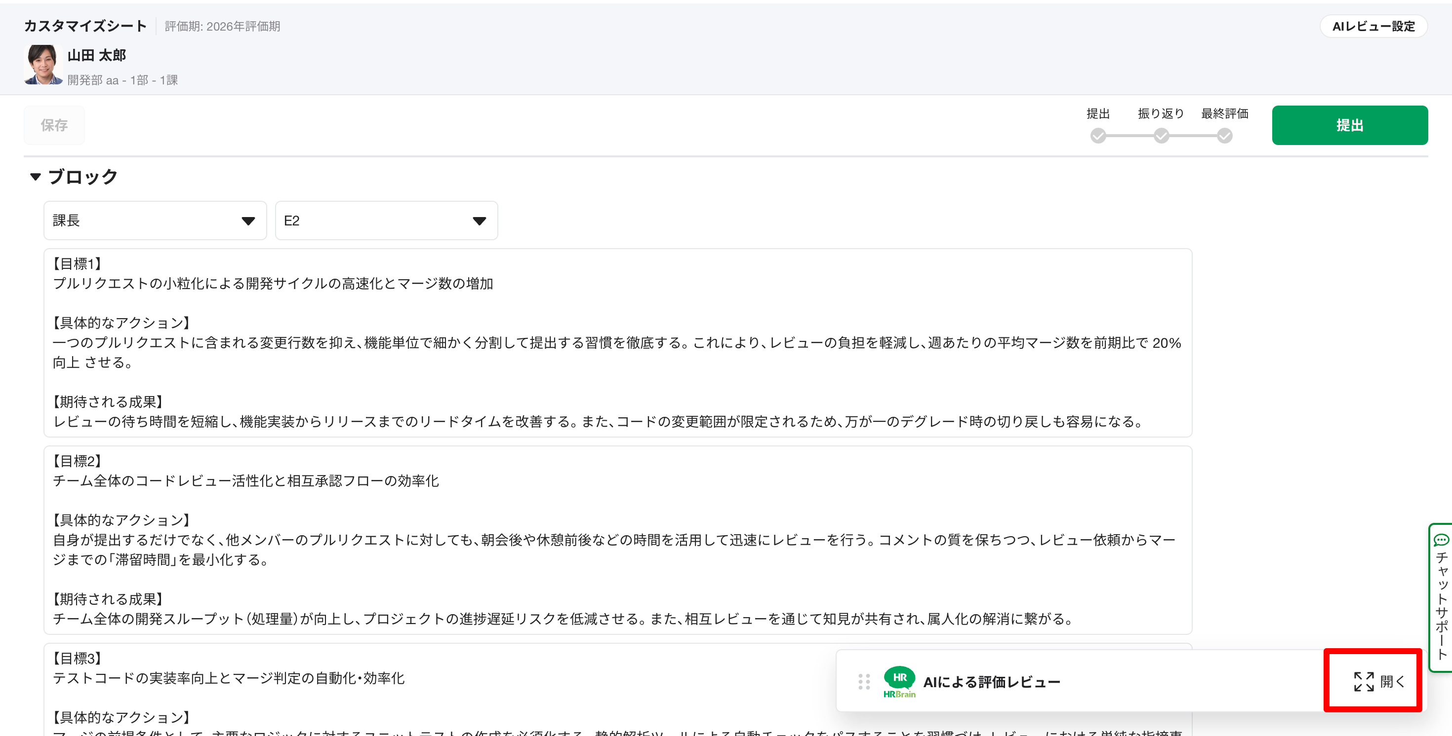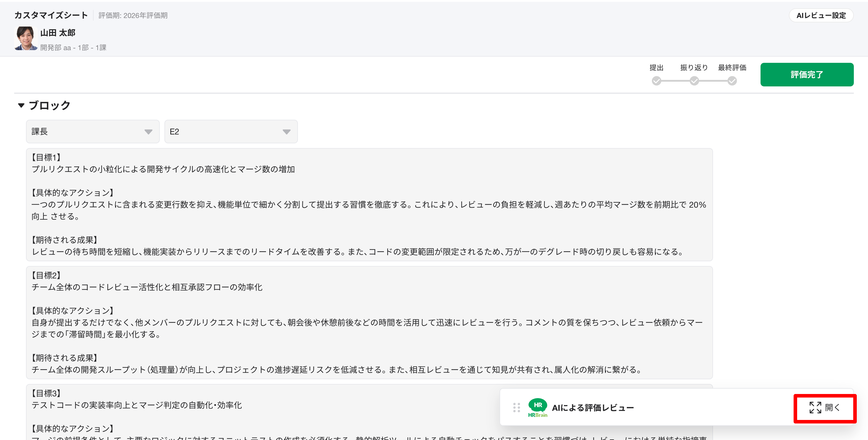 ・「AIによる評価レビュー」のパネルを開くと、レビュー対象の項目と役職・等級の項目がハイライトされます