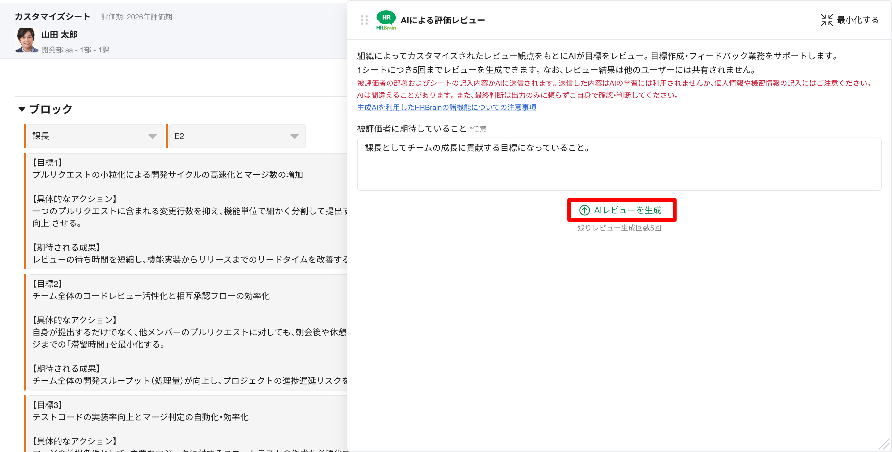 被評価者が記入した目標内容に対して、AI(LLM)によるレビューを実行し、レビュー結果を画面上で確認できる機能です。