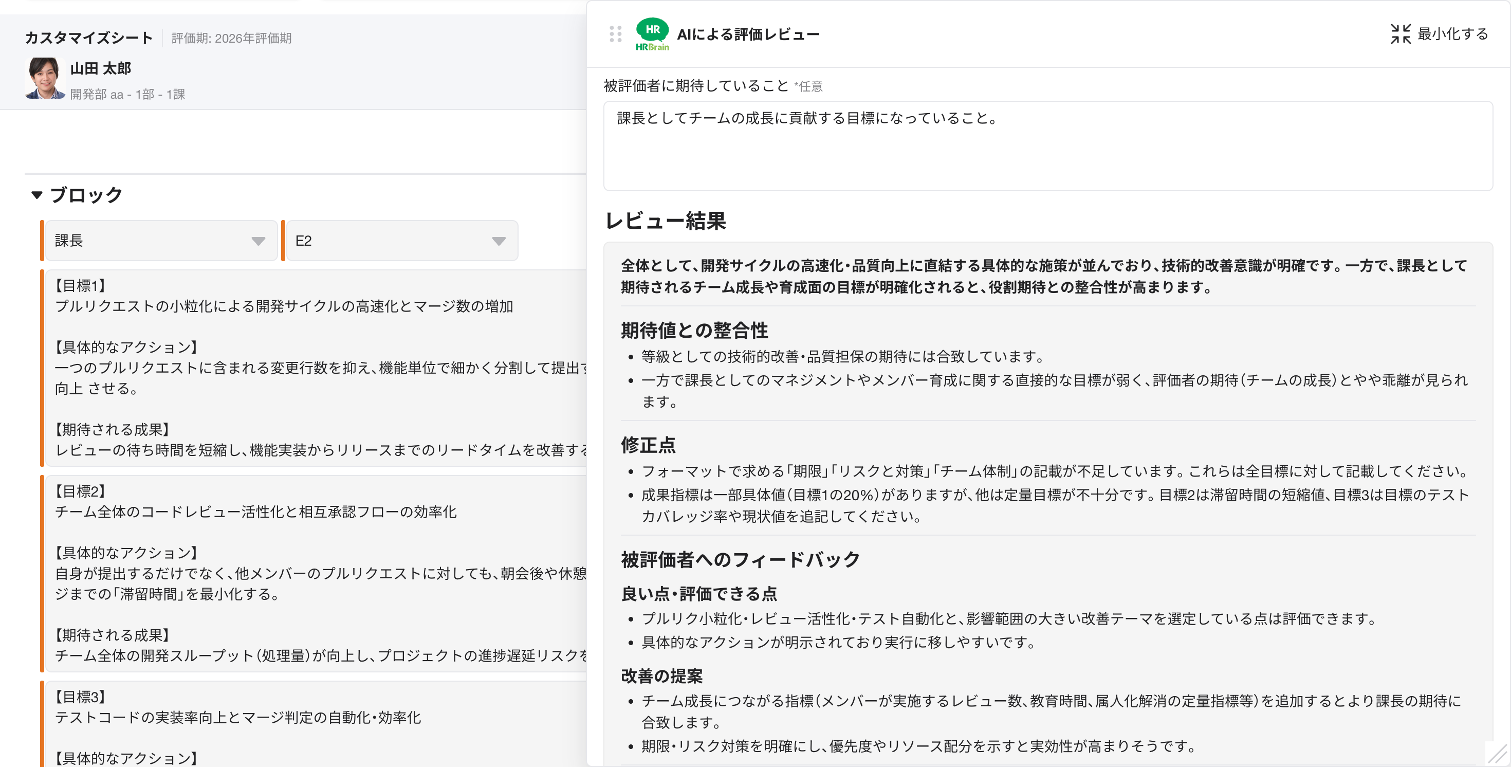 被評価者は提出前に自身の目標を自己チェックでき、評価者は担当メンバーの目標に対してフィードバックの起点となるレビューを生成できます。