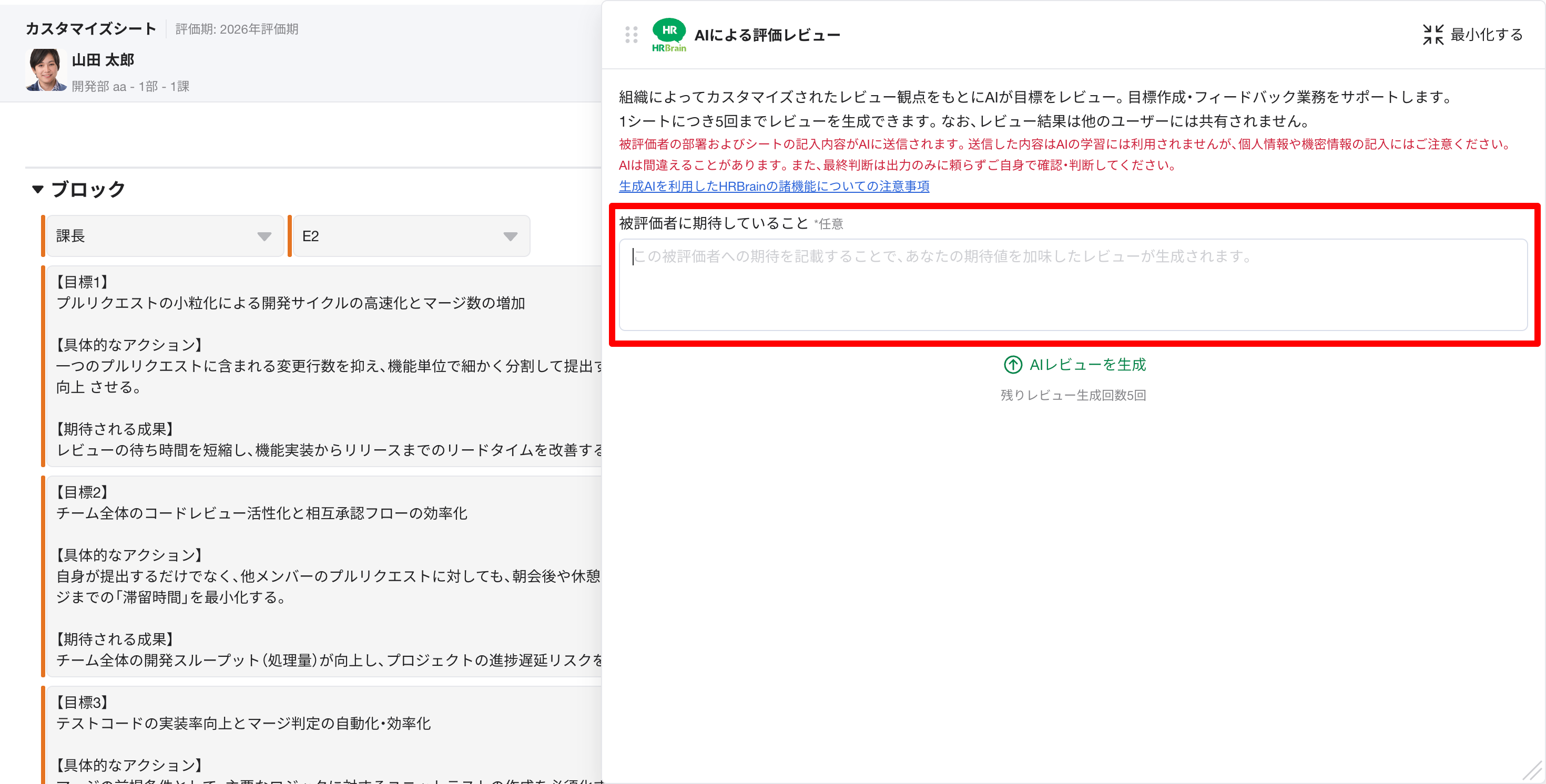 ・AIレビュー実行前に「被評価者に期待していること」(フリーテキスト)を任意で入力できます(1000文字以内)