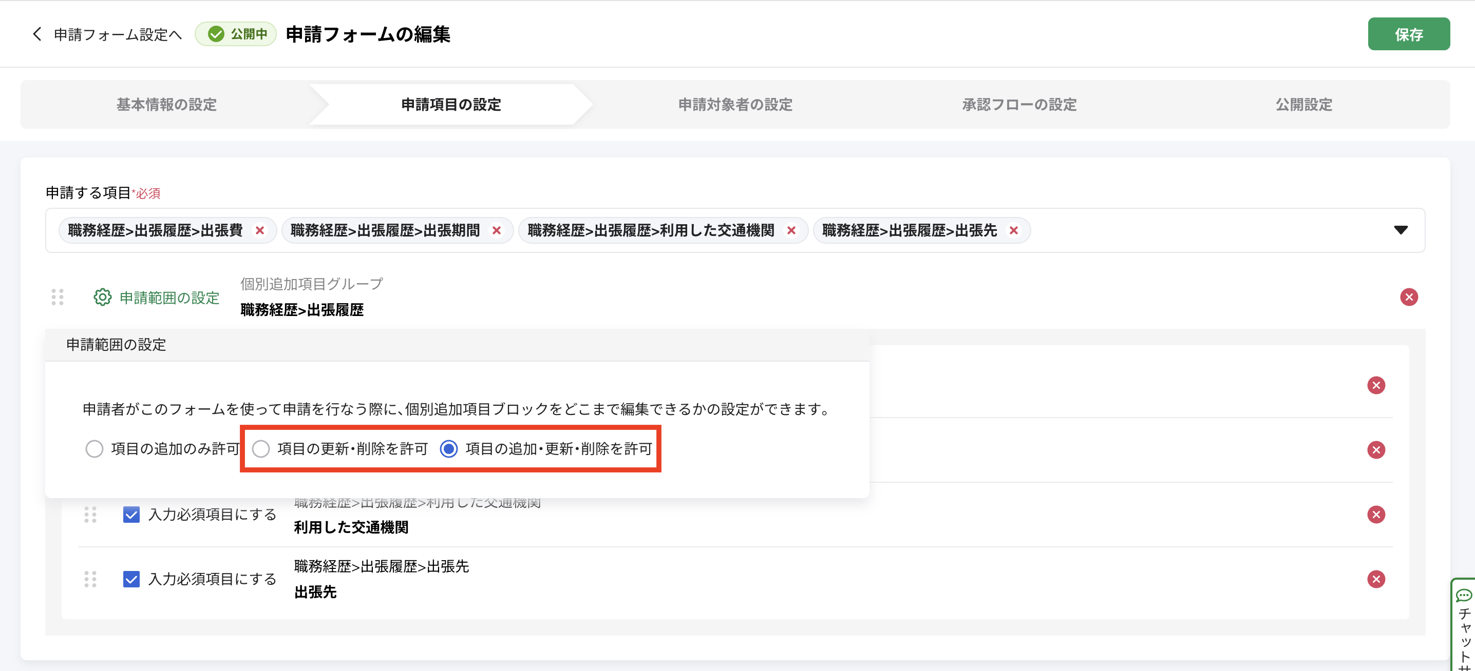 - 申請項目に個別追加項目を設定していて「申請範囲の設定」で項目の削除を許可している設定状況
